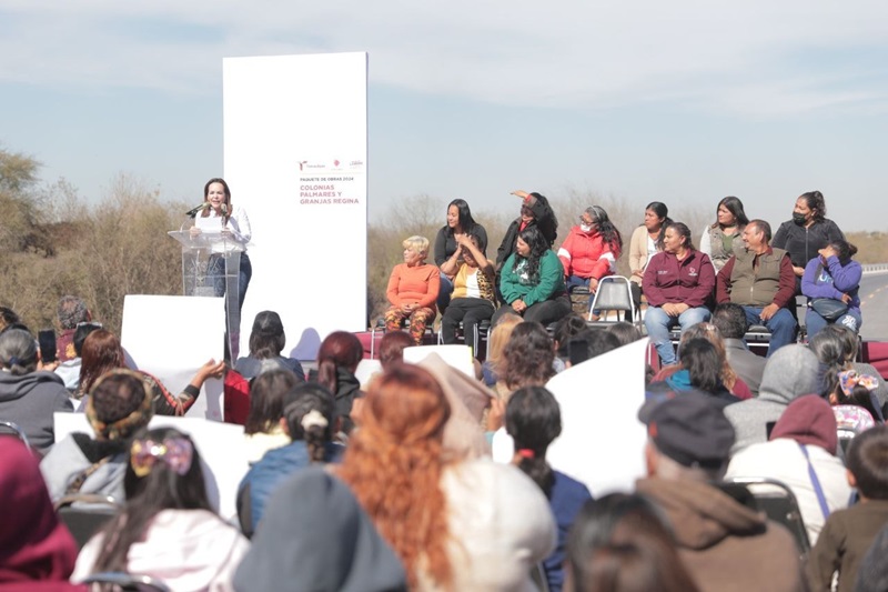 La presidenta municipal acompañada de síndicos y regidores entregó a los habitantes de las colonias Palmares y Granjas Regina un paquete de obras que incluye la construcción del eje vial Río Bravo, así como pavimentaciones, repavimentaciones y beneficios para dos primarias de este sector con una inversión aproximada de 35 millones de pesos.
