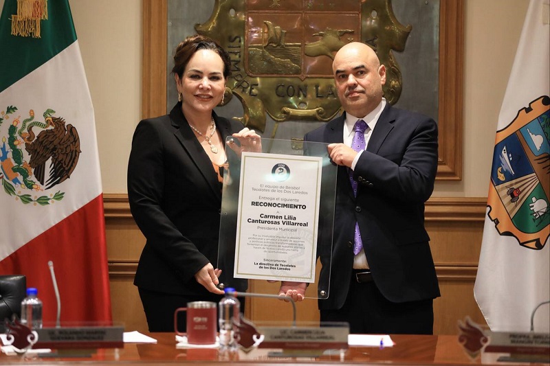 NUEVO LAREDO, TAMPS. Luego de que el Cabildo de Nuevo Laredo aprobó otorgar en comodato el estadio de béisbol “La Junta” al equipo profesional Tecolotes de los Dos Laredos, el director general de los Tecolotes, Chara Mansur Beltrán entregó un reconocimiento a la presidenta municipal por su apoyo al deporte profesional y amateur en la ciudad.
