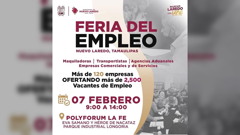 NUEVO LAREDO, TAMPS. El Gobierno Municipal a través de la Secretaría de Desarrollo Económico, anunció la primera Feria del Empleo 2024 que se realizará este 7 de febrero en horario de las 9:00 AM a las 14:00 PM en el Polyforum La Fe.