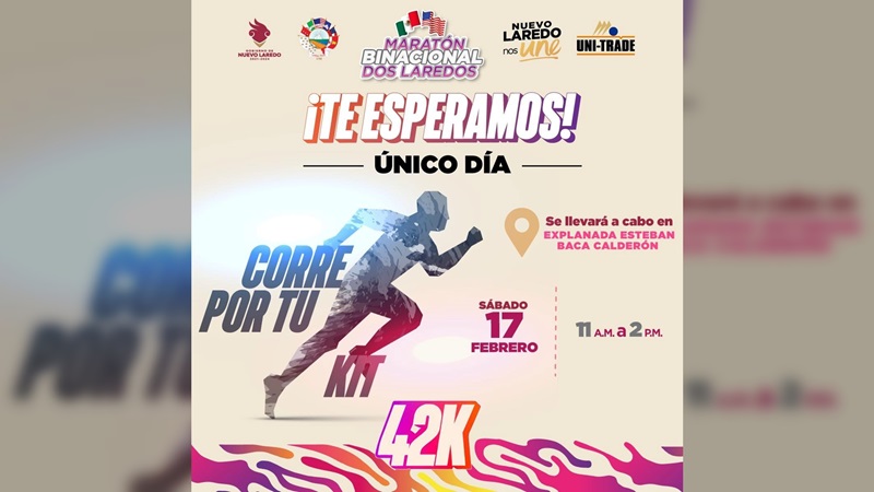 Este maratón que se llevará a cabo el 18 de febrero, es único en el mundo, ya que su trayecto de 42 kilómetros abarca dos países, iniciando su recorrido en la Plaza Jarvis de Laredo, Texas para concluir frente al Palacio Federal de Nuevo Laredo.