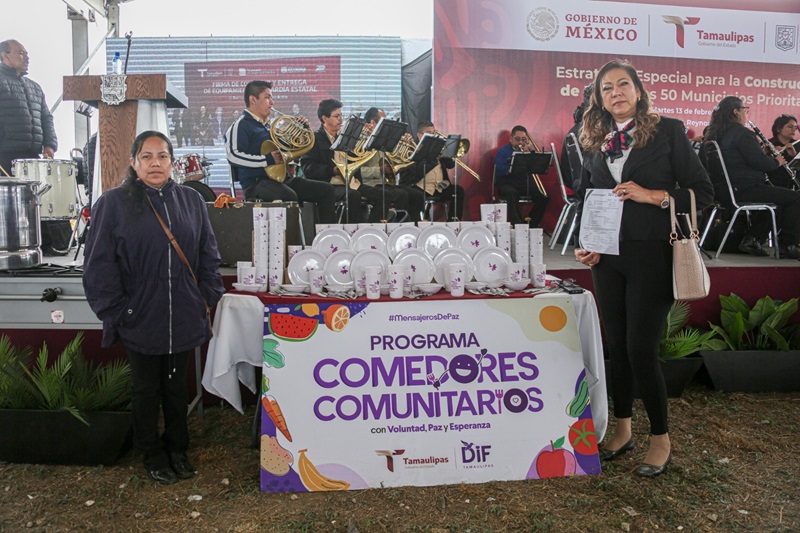 REYNOSA, TAMPS. Como parte de las actividades que se realizaron en la ‘Feria de Paz’ en esta ciudad fronteriza, el Sistema DIF Tamaulipas que preside la doctora María de Villarreal hizo entrega de 540 mil 790 artículos de equipamiento a 2,566 desayunadores y comedores, beneficiando a 112 mil 914 personas atendidas con los Programas Desayunos Escolares y Comedores Comunitarios con Voluntad, Paz y Esperanza en todo el estado.