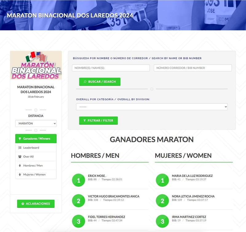 Todos los resultados y tiempos ya han sido publicados y se pueden consultar en la página web https://www1.marcate.com.mx/, ahí deberán buscar en el menú la opción de “Resultados”, acceder y posteriormente dar click a la imagen del Maratón Binacional Dos Laredos.