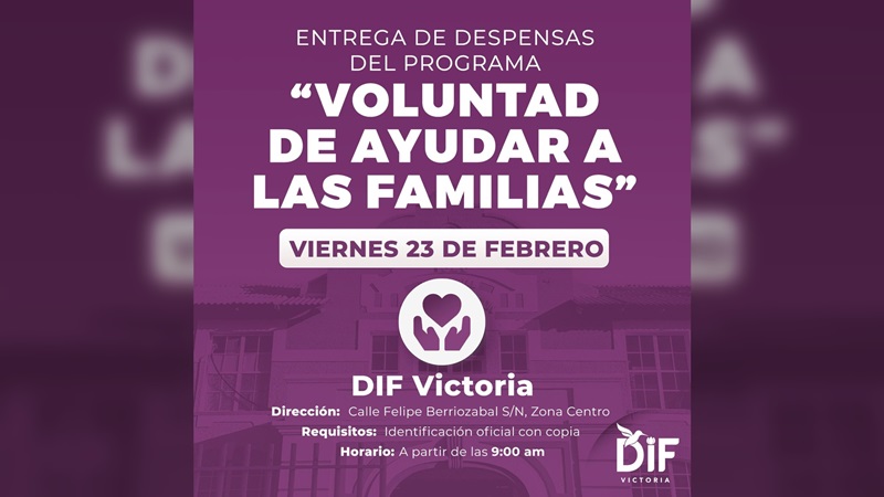 CIUDAD VICTORIA, TAMPS. Como parte de las acciones contempladas en el programa alimentario del DIF Victoria en coordinación con el DIF Tamaulipas, se realizará la entrega de despensas de la iniciativa “Voluntad de Ayudar a las Familias” la cual consiste en una entrega trimestral de dotación alimenticia a las familias en situación de vulnerabilidad en el Estado de Tamaulipas.