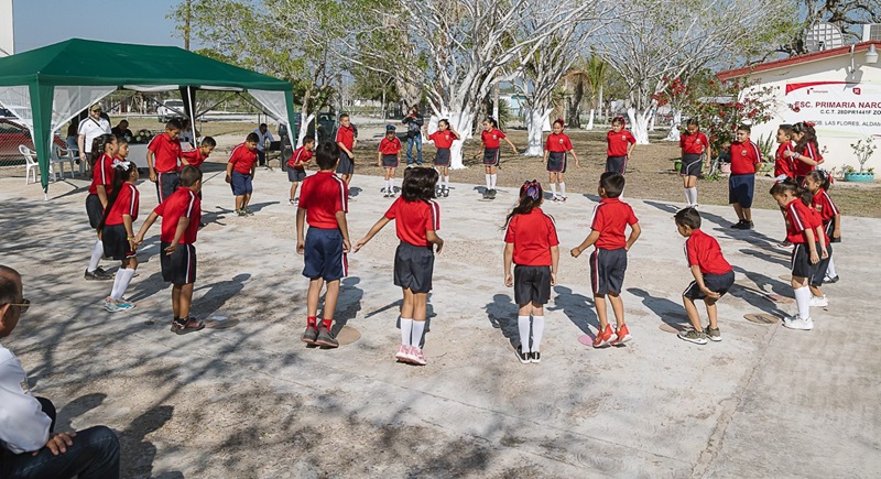 ALDAMA, TAMPS. En su visita al municipio de Aldama, la secretaria de Educación, Lucía Aimé Castillo Pastor, acudió a la Escuela Primaria “Narciso Mendoza”, del poblado Las Flores de Morón, donde compartió en comunidad con maestras, maestras, directivos, madres, padres y estudiantes de la localidad, apreciando las exhibiciones de actividad física y muestra pedagógica sobre la enseñanza en las aulas.