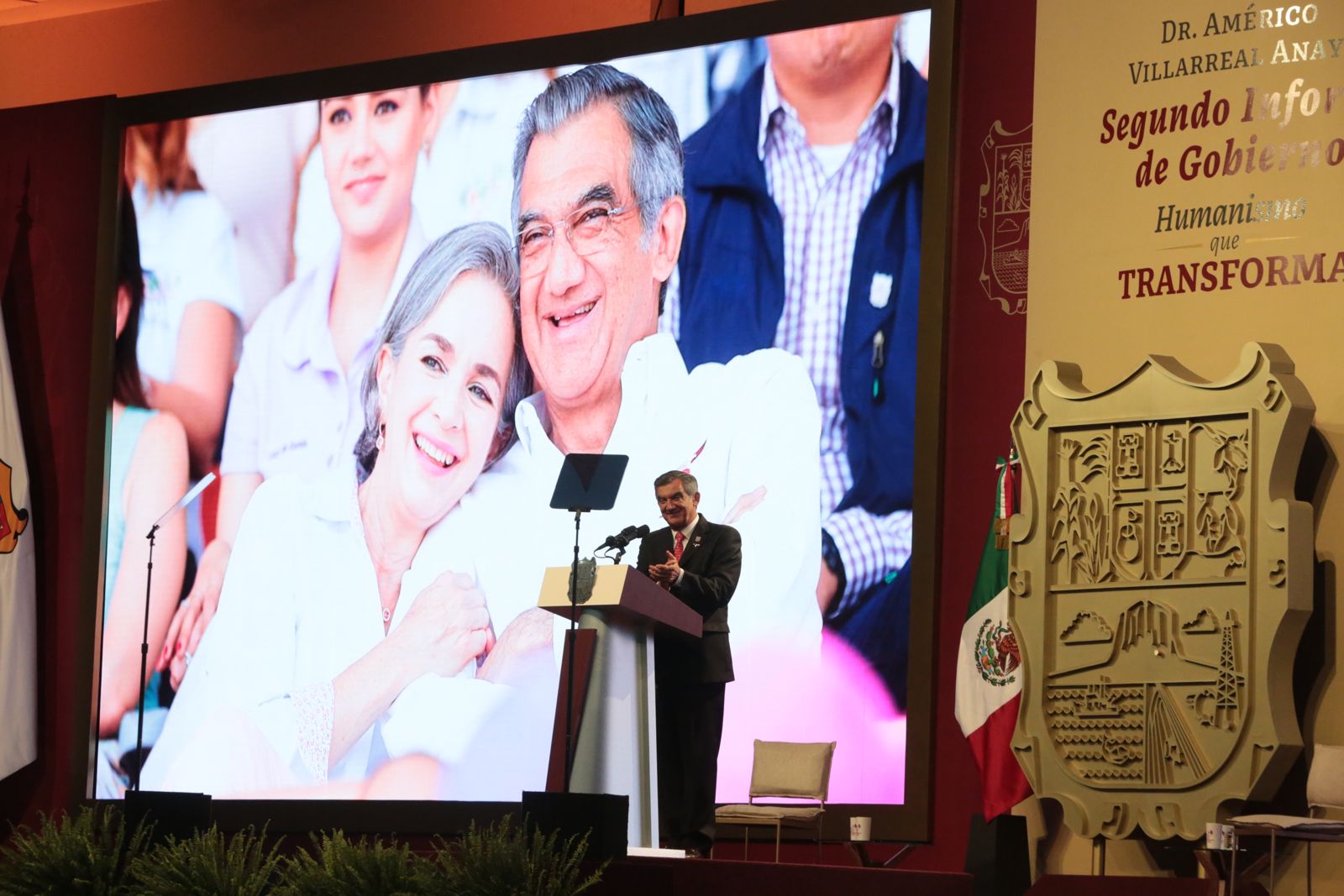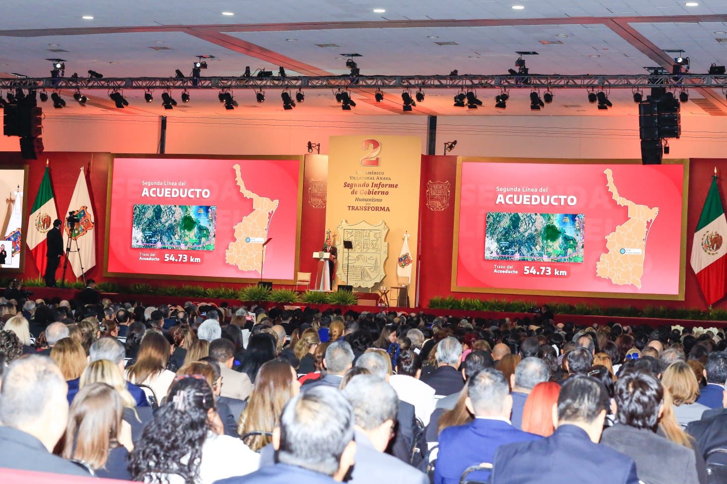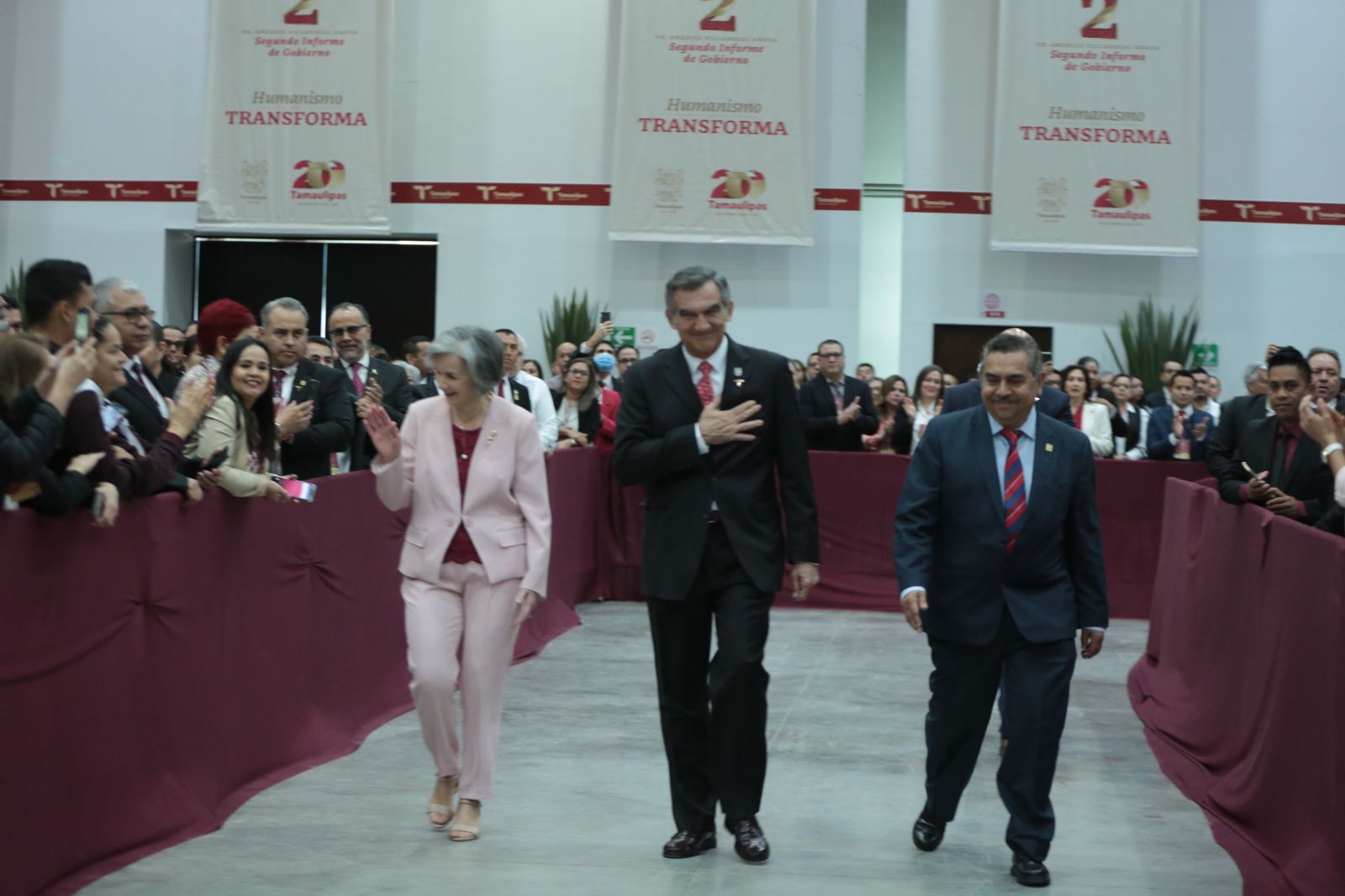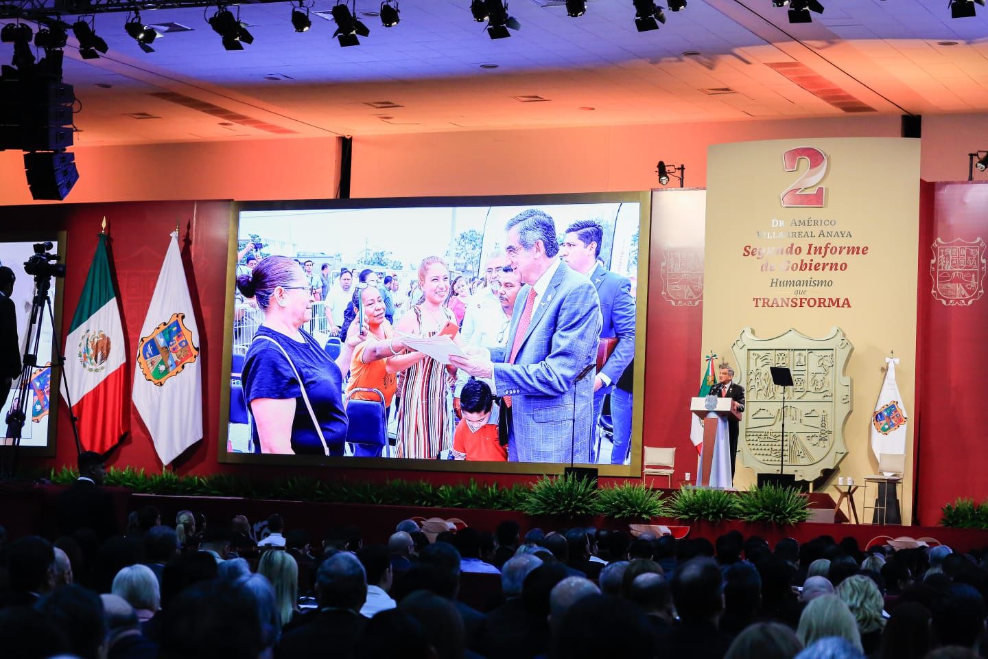 Ante la presencia de la presidenta del DIF, Tamaulipas, María de Villarreal y titulares de los Poderes Legislativo y Judicial, integrantes del gabinete federal, legisladores, mandos militares y de las fuerzas armadas, dirigentes de organismos industriales, cámaras empresariales y representantes de todos los sectores productivos, el mandatario tamaulipeco señaló que el segundo informe entregado este día al Honorable Congreso de Tamaulipas sobre el estado que guarda la administración pública, describe de manera detallada las 857 acciones realizadas, atendiendo a los marcos estratégicos de la planeación democrática y aterrizan en los objetivos de los tres grandes ejes del Plan Estatal de Desarrollo: Gobierno al Servicio del Pueblo, Desarrollo Inclusivo y Sostenible y Política Social para el Bienestar.