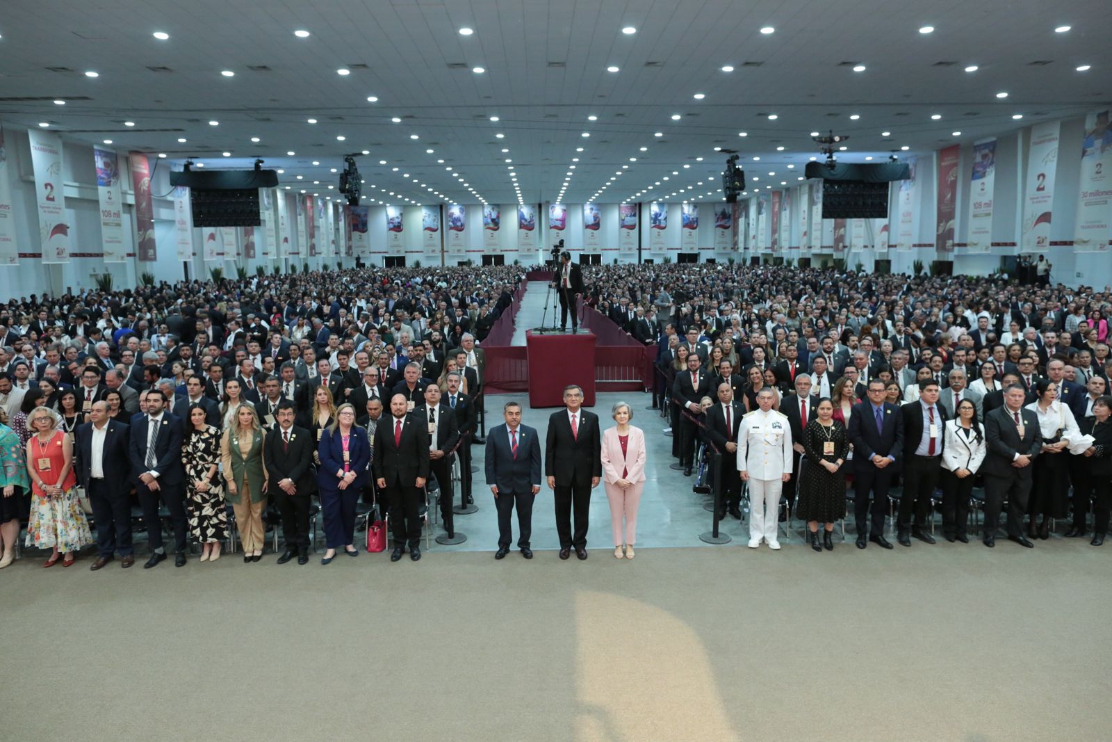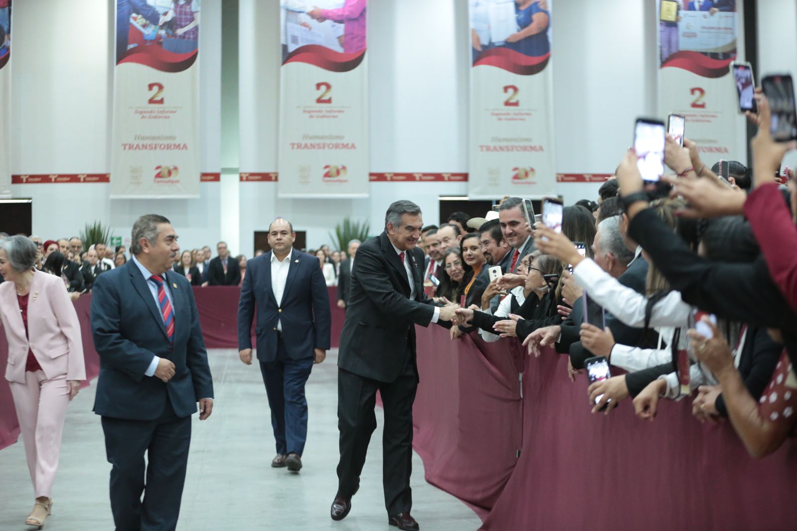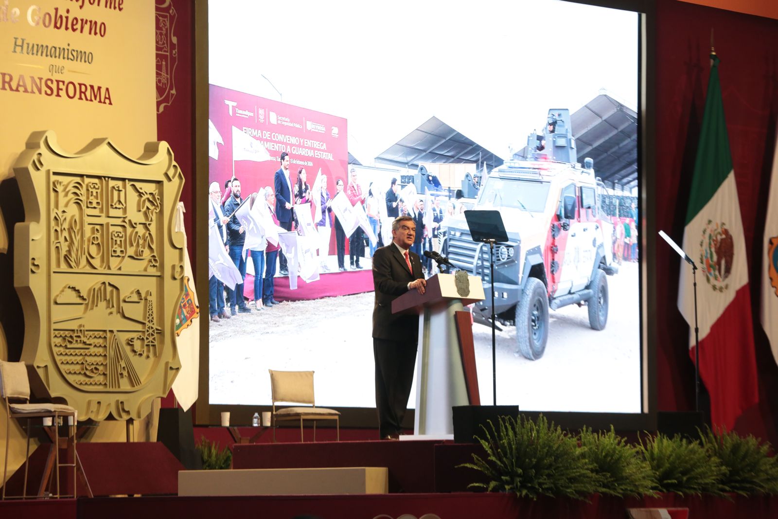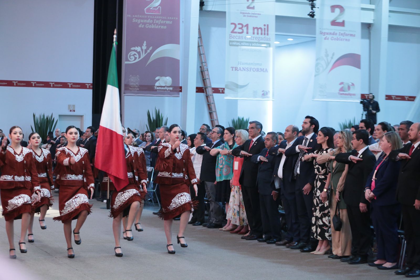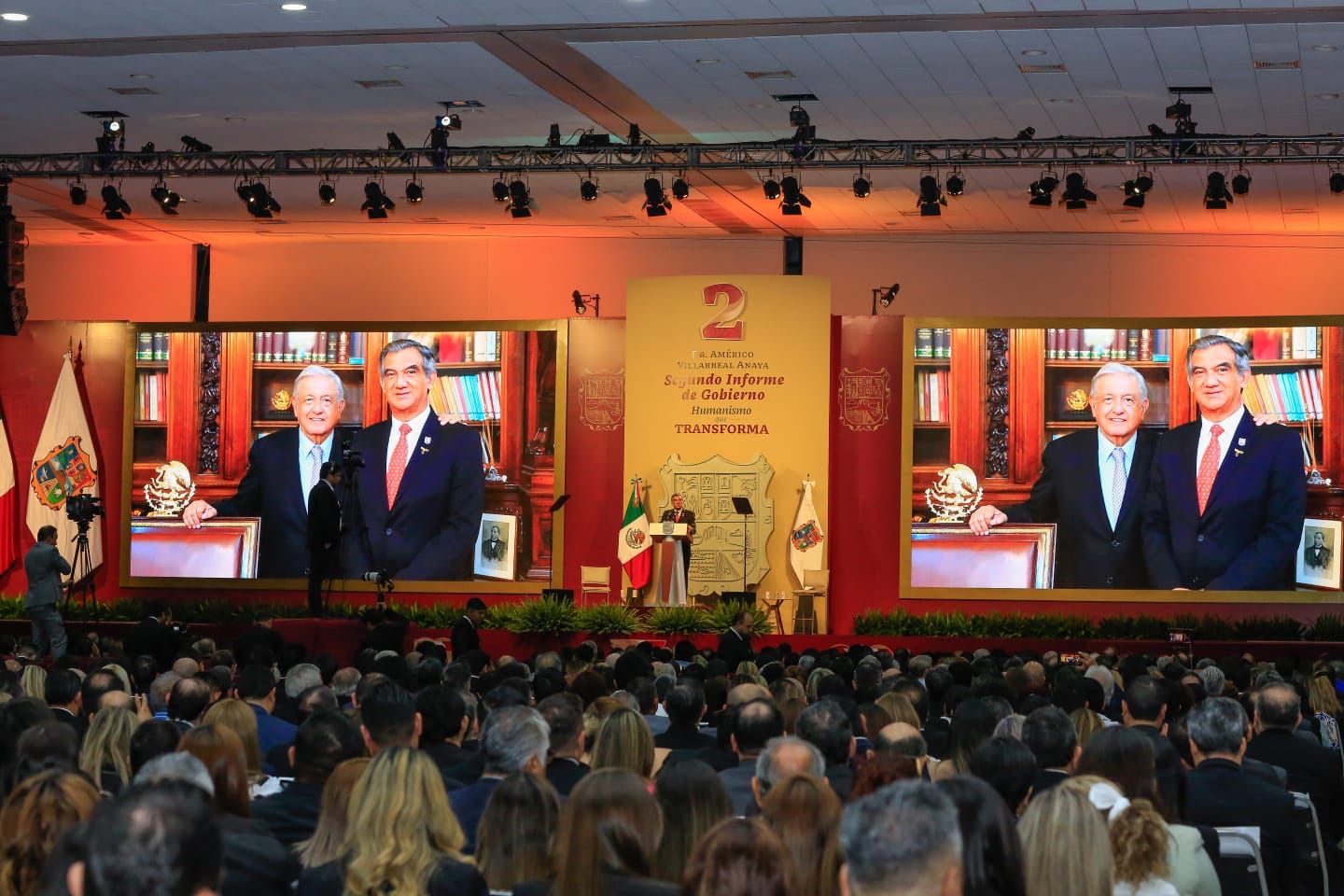 Ante la presencia de la presidenta del DIF, Tamaulipas, María de Villarreal y titulares de los Poderes Legislativo y Judicial, integrantes del gabinete federal, legisladores, mandos militares y de las fuerzas armadas, dirigentes de organismos industriales, cámaras empresariales y representantes de todos los sectores productivos, el mandatario tamaulipeco señaló que el segundo informe entregado este día al Honorable Congreso de Tamaulipas sobre el estado que guarda la administración pública, describe de manera detallada las 857 acciones realizadas, atendiendo a los marcos estratégicos de la planeación democrática y aterrizan en los objetivos de los tres grandes ejes del Plan Estatal de Desarrollo: Gobierno al Servicio del Pueblo, Desarrollo Inclusivo y Sostenible y Política Social para el Bienestar.