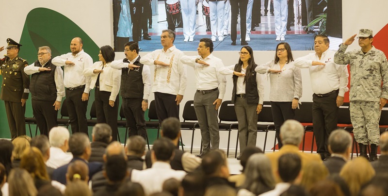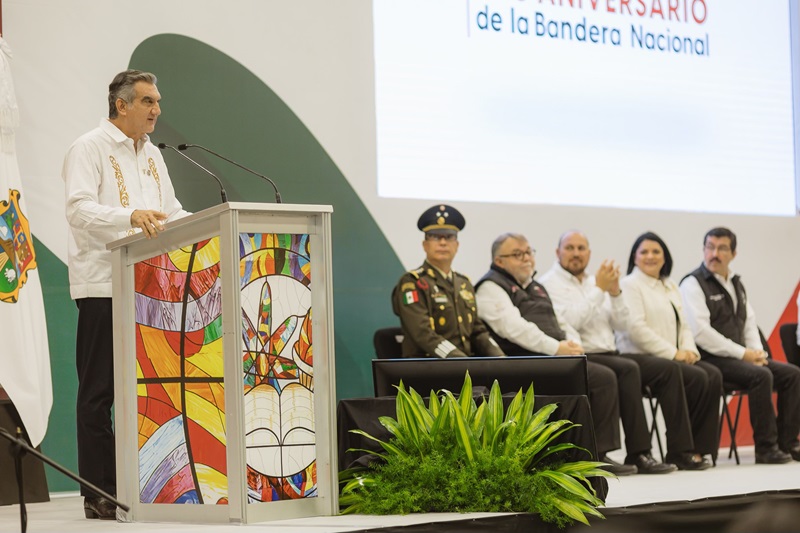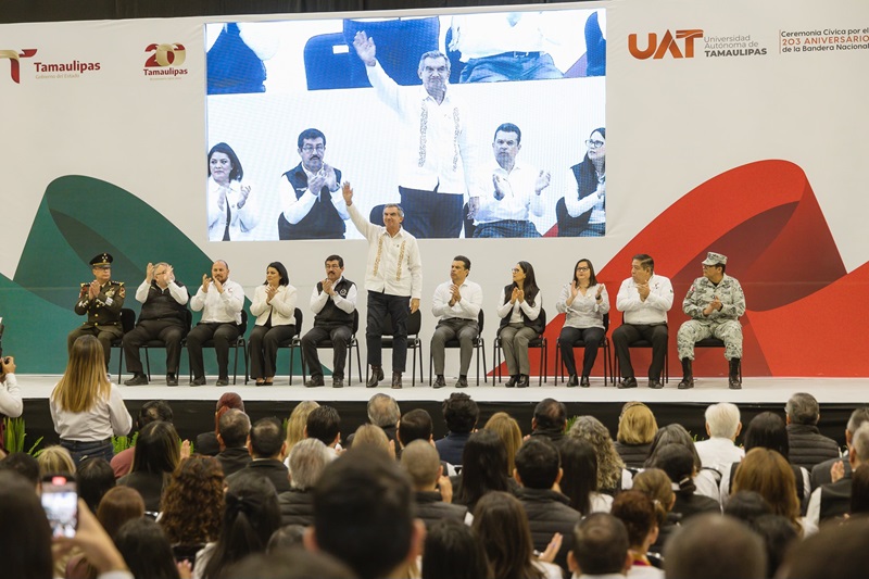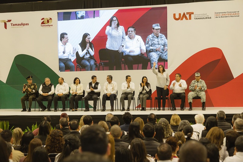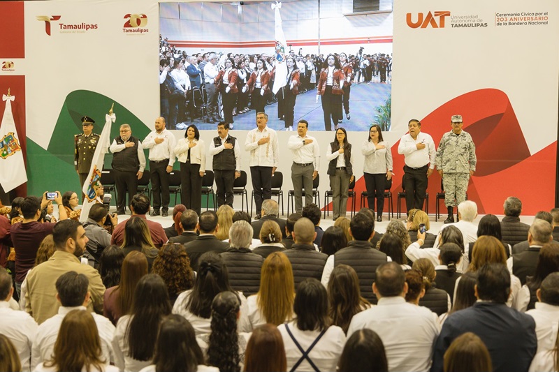 CIUDAD VICTORIA, TAMPS. La secretaria de Educación de Tamaulipas, Lucía Aimé Castillo Pastor, acompañó al gobernador Américo Villarreal Anaya, a la Ceremonia Cívica de Honores a la Bandera que se celebró en las instalaciones del Gimnasio Multidisciplinario de la Universidad Autónoma de Tamaulipas (UAT), donde también estuvieron presentes el Rector de la UAT, Dámaso Anaya Alvarado, titulares del gabinete estatal, presidente municipal de Victoria y la comunidad universitaria de la máxima casa de estudios del estado.