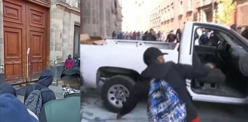 AGENCIAS. Los estudiantes de la normal rural de Ayotzinapa y simpatizantes de su movimiento estrellaron una camioneta contra el portón de la calle de Moneda, en Palacio Nacional, acceso directo a la mañanera de Andrés Manuel López Obrador.
