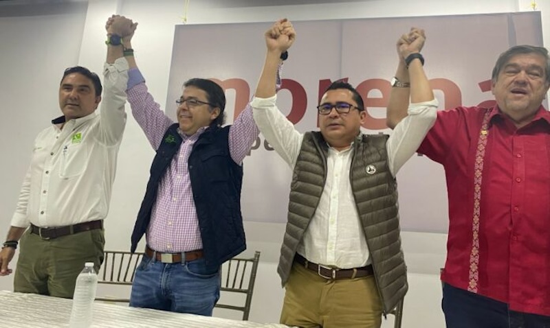 Con Mario Llergo, levantando el brazo de Jorge ‘Tico’ García aparecieron los dirigentes estatales del Partido Verde, Manuel Muñoz Cano; y Arcenio Ortega, del PT.