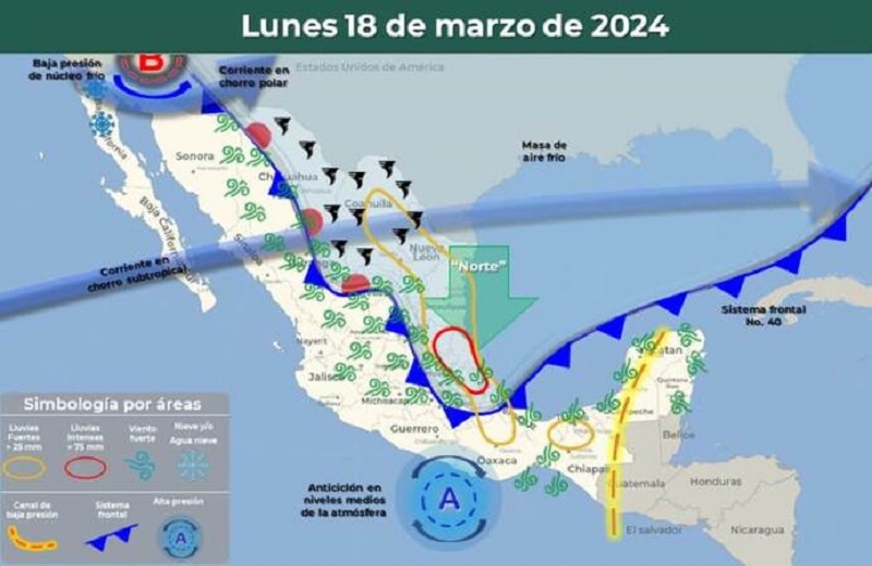 El sistema frontal se extiende sobre el norte y noreste de México, interacciona con un canal de baja presión en el oriente y sureste del país y con la corriente en chorro subtropical, propiciando chubascos y lluvias puntuales fuertes acompañadas de descargas eléctricas y posible caída de granizo.