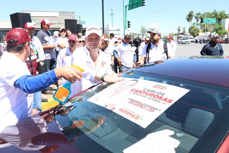 NUEVO LAREDO, TAMPS. El sonido de los claxons, las porras y muestras de apoyo invadieron el crucero de Reforma y Paseo Colón donde cientos de automovilistas y personas que pasaban por el lugar se detuvieron para respaldar y sumarse al proyecto del candidato de la coalición MORENA, PT y Verde Ecologista, Carlos Canturosas Villarreal.