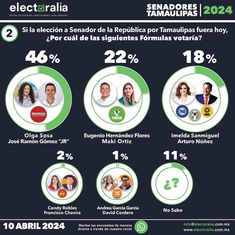 A la pregunta, “Si la elección a Senador de la República por Tamaulipas fuera hoy, ¿Por cuál de las siguientes Fórmulas votaría? El 22% por ciento dijo que por Eugenio y Maki, contra un 20% por ciento que dijo votaría por ellos el mes pasado.
