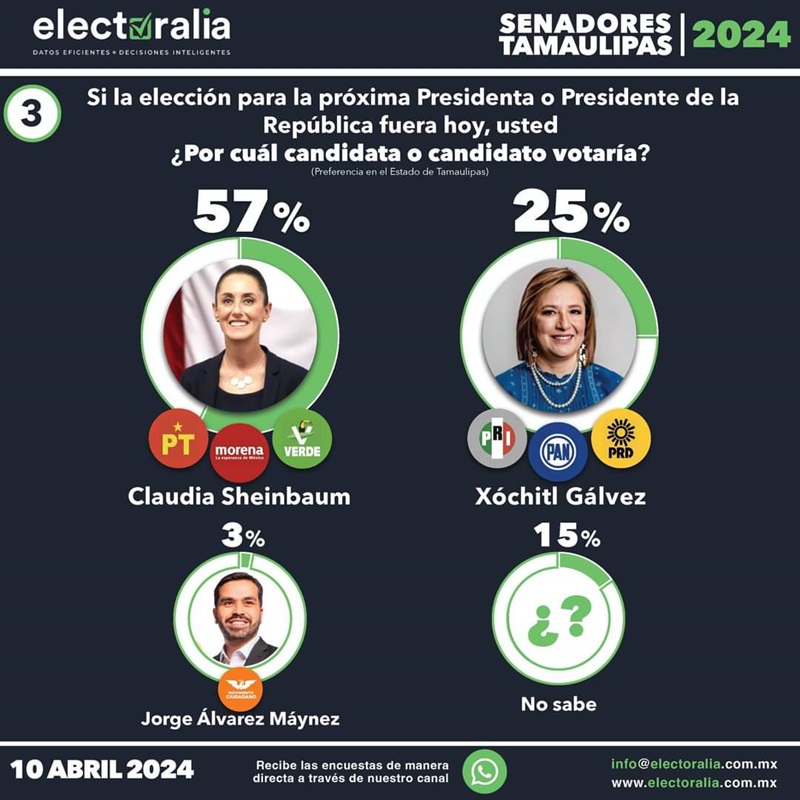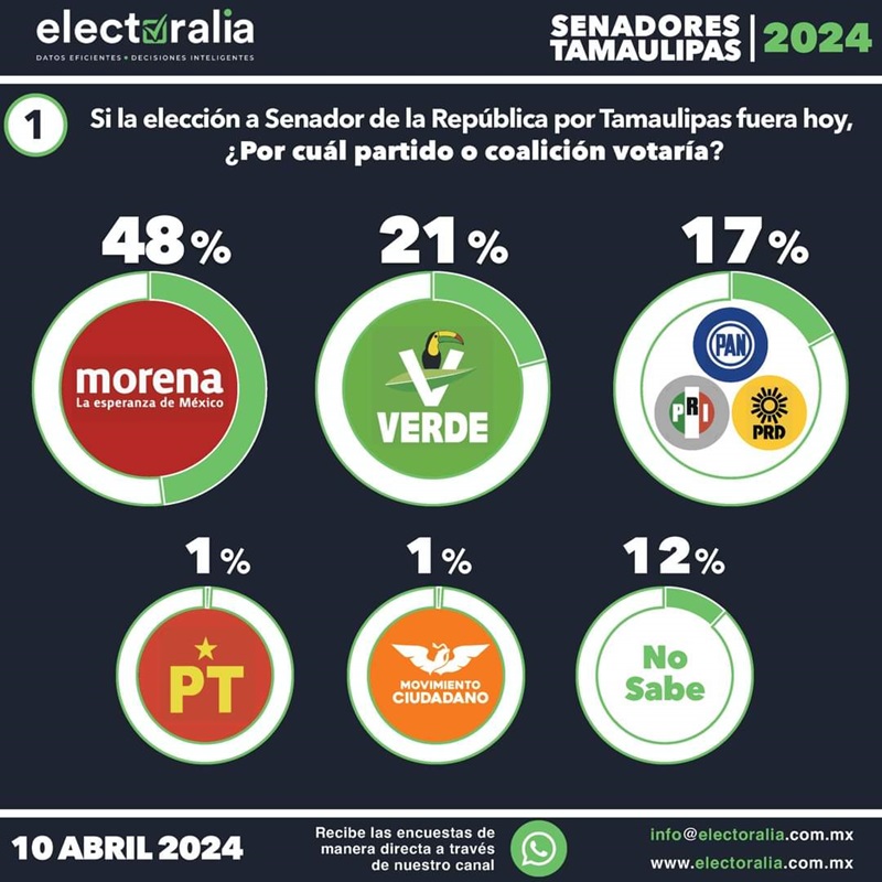 En los resultados de la más reciente encuesta presentados este 10 de abril, a la pregunta expresa de “Si la elección a Senador de la República por Tamaulipas fuera hoy, ¿Por cuál partido o coalición votaría?” el 21% por ciento respondió que por el Verde, mientras que en marzo era el 19% por ciento.