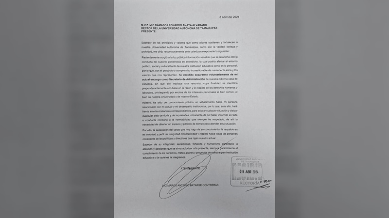 De acuerdo con el documento entregado al rector Dámaso Leonardo Anaya Alvarado, con fecha del 8 de abril de 2024, Batarse Contreras explica que ha tomado la decisión de separarse voluntariamente de sus funciones con la finalidad de atender señalamientos que lo involucran en presuntos hechos de índole personal y que son ajenos a la institución.
