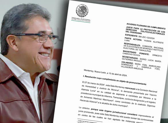 Cabe precisar que la Comisión de Justicia de Morena, en cumplimiento de la orden emitida por la Sala Monterrey, declaró improcedente la queja de Alatriste Luna sobre el registro de Martínez como candidato de la Coalición Sigamos Haciendo Historia a la presidencia municipal de Altamira.