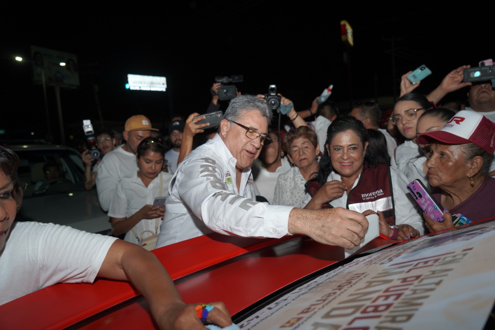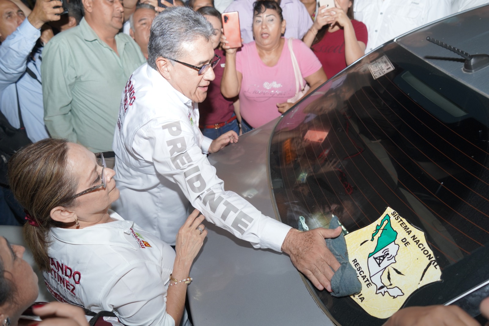 El punto de encuentro fue en la intersección de los bulevares Allende y Cuco Sánchez, donde el Dr. Armando Martínez, acompañado de su esposa C.P. Rossy Luque de Martínez, miembros de su familia, así como integrantes de órganos sindicales y agrupaciones, entre ellos del magisterio, transporte público, SITRACE, y ciudadanía en general, agradeció el respaldo recibido mientras realizaba la colocación de calcas en más de 700 vehículos de simpatizantes que demostraron su apoyo para que Altamira continúe transformándose en una ciudad de bienestar y progreso bajo su liderazgo.