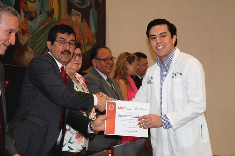 TAMPICO, TAMPS. El MVZ Dámaso Leonardo Anaya Alvarado, rector de la Universidad Autónoma de Tamaulipas (UAT), entregó reconocimientos a treinta y siete profesionales de la medicina que concluyeron su formación con la más alta calificación del Examen General de Egreso (EGEL) del Centro Nacional de Evaluación para la Educación Superior (CENEVAL).