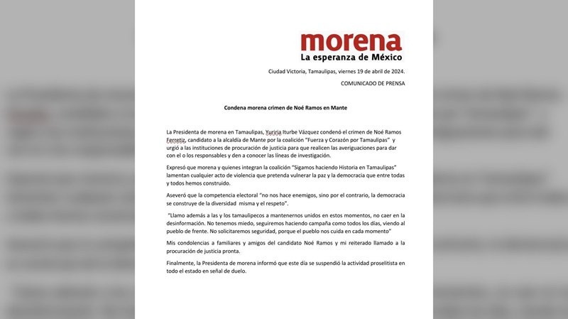 CIUDAD VICTORIA, TAMPS. La Presidenta de Morena en Tamaulipas, Yuriria Iturbe Vázquez condenó el crimen de Noé Ramos Ferretiz, candidato a la alcaldía de Mante por la coalición “Fuerza y Corazón por Tamaulipas” y urgió a las instituciones de procuración de justicia para que realicen las averiguaciones para dar con el o los responsables y den a conocer las líneas de investigación.