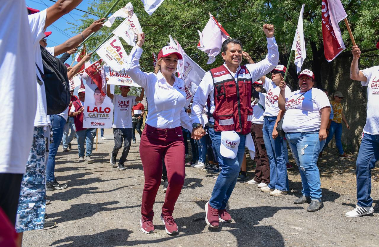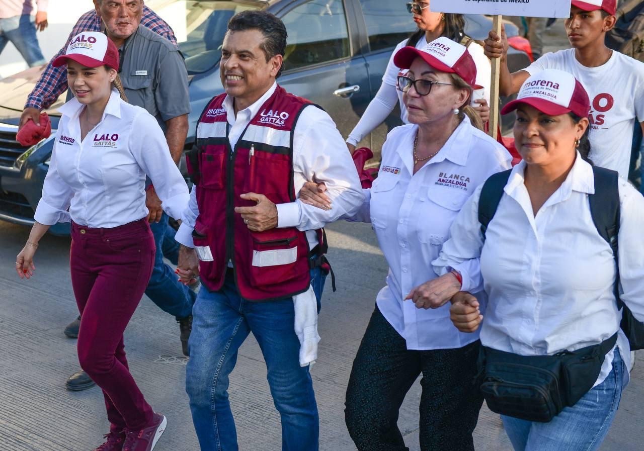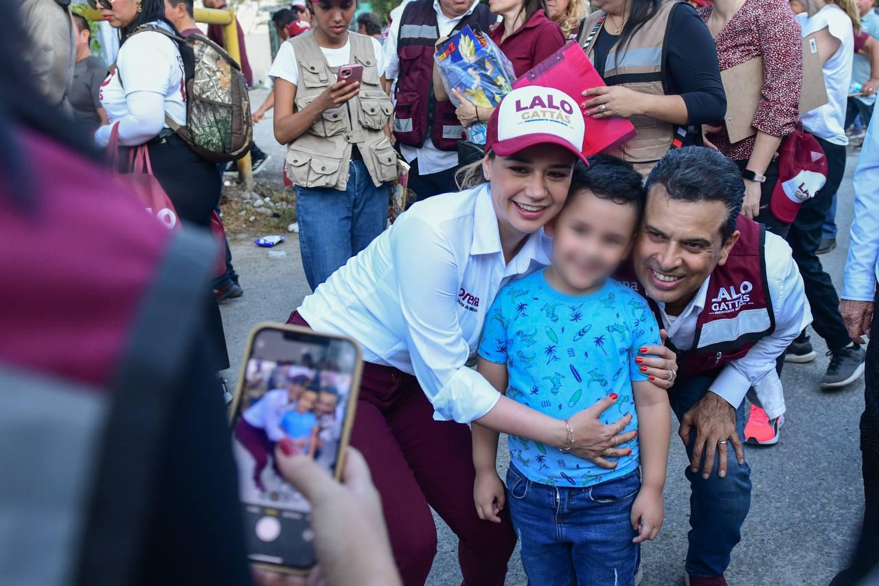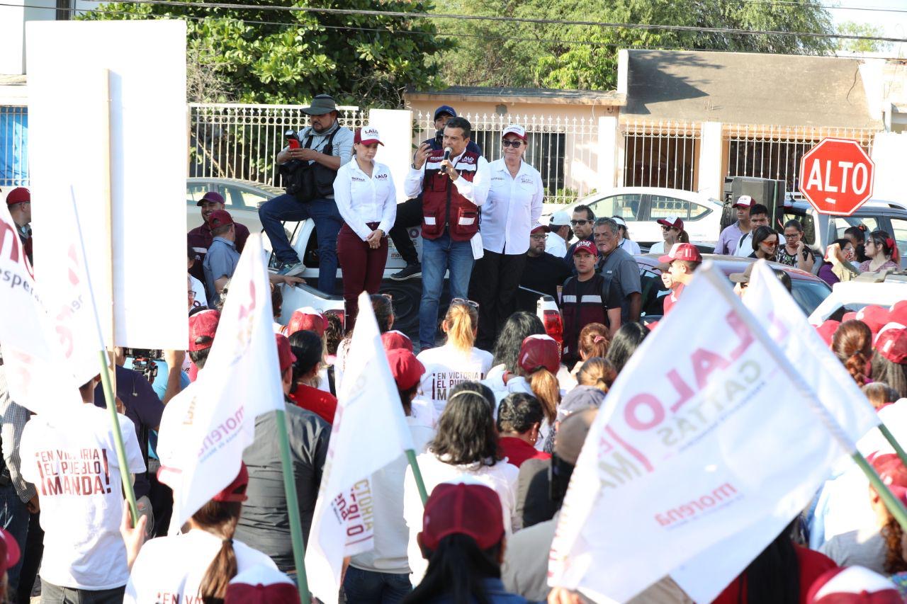 CIUDAD VICTORIA, TAMPS. Al frente de la ola guinda y con paso firme, Lalo Gattás y su esposa Lucy recorrieron este martes las colonias Moderna e Ignacio Zaragoza donde recibió el respaldo contundente del electorado para avanzar juntos hacia el triunfo y la transformación de Victoria.