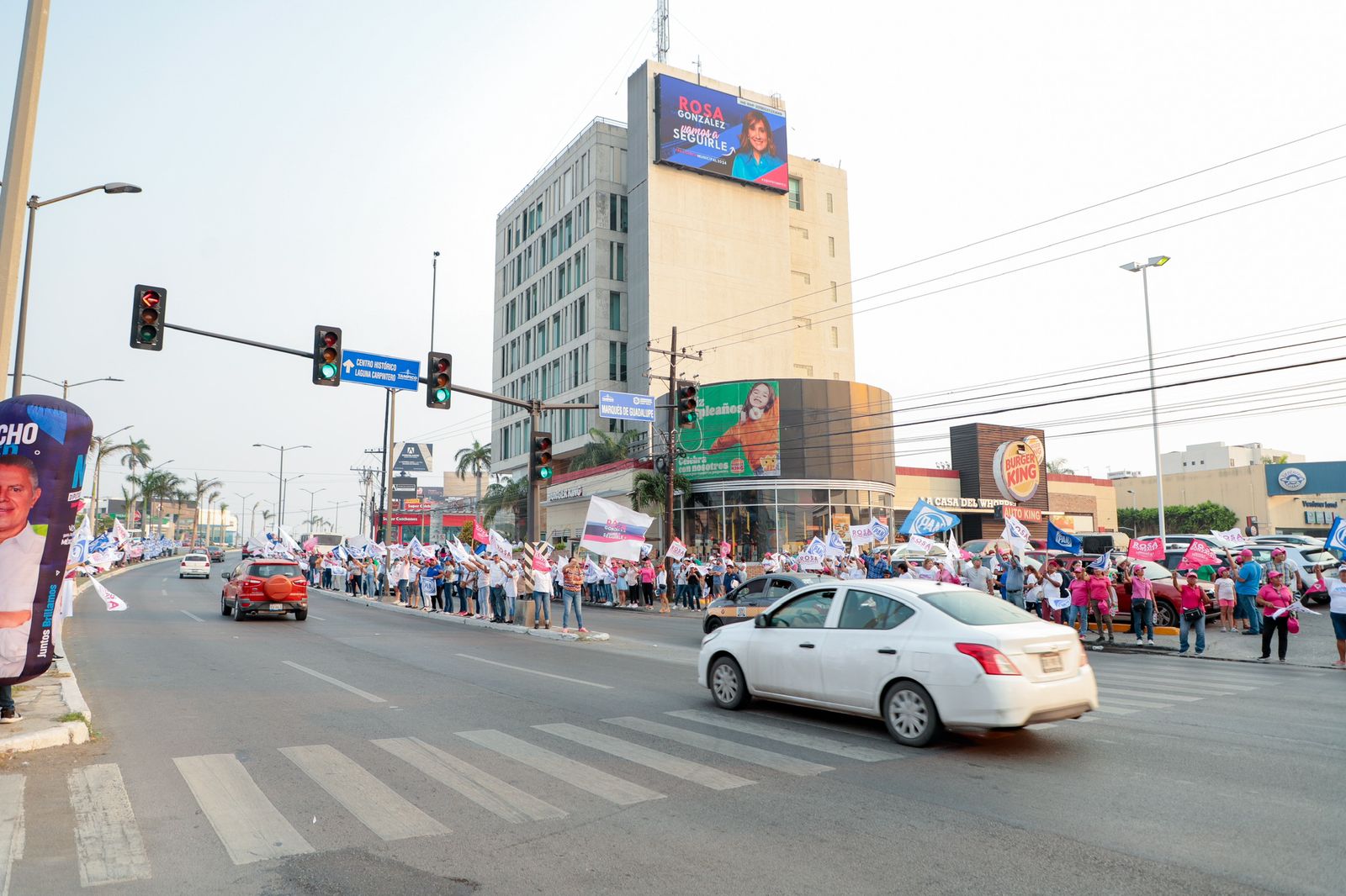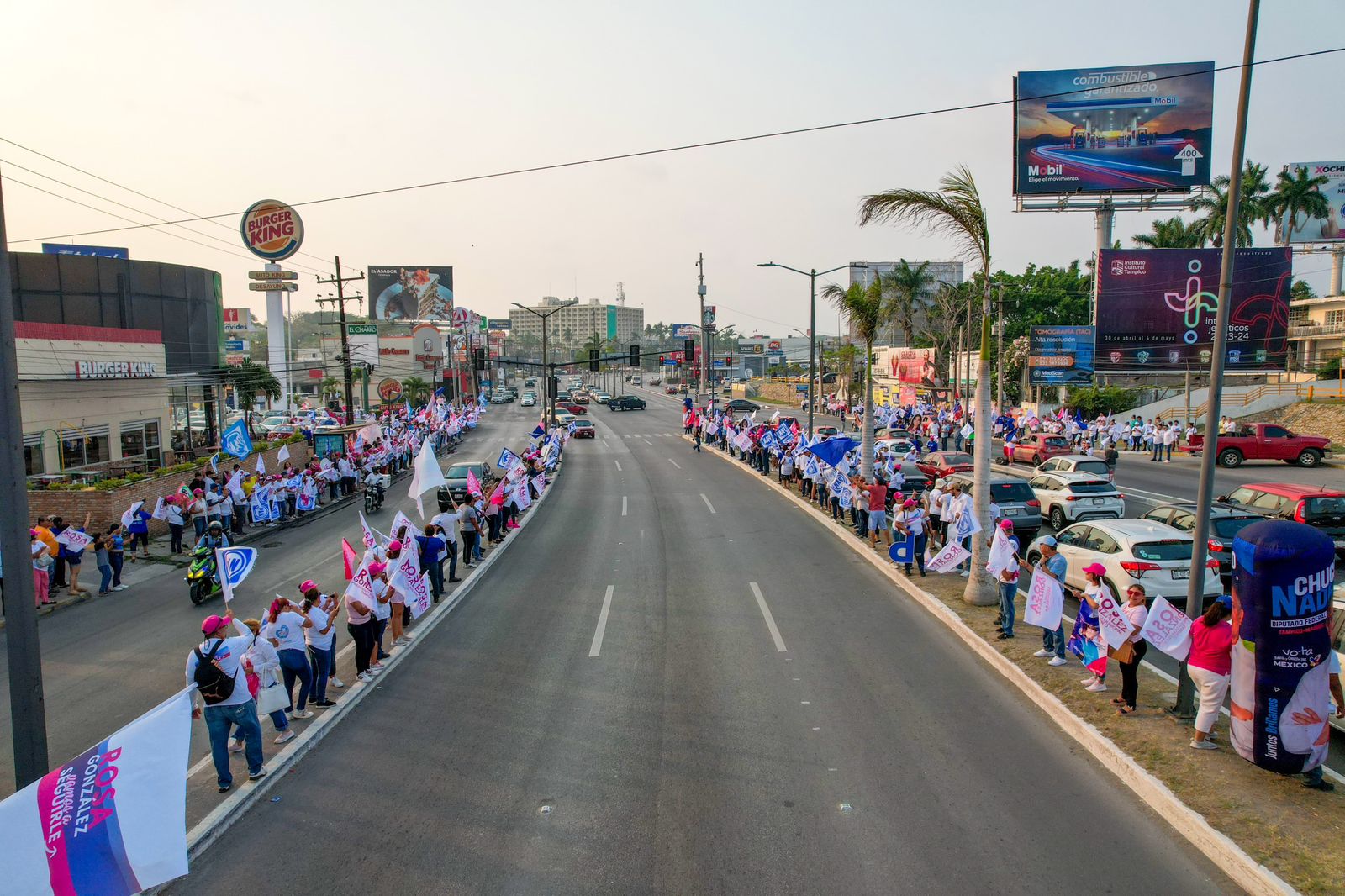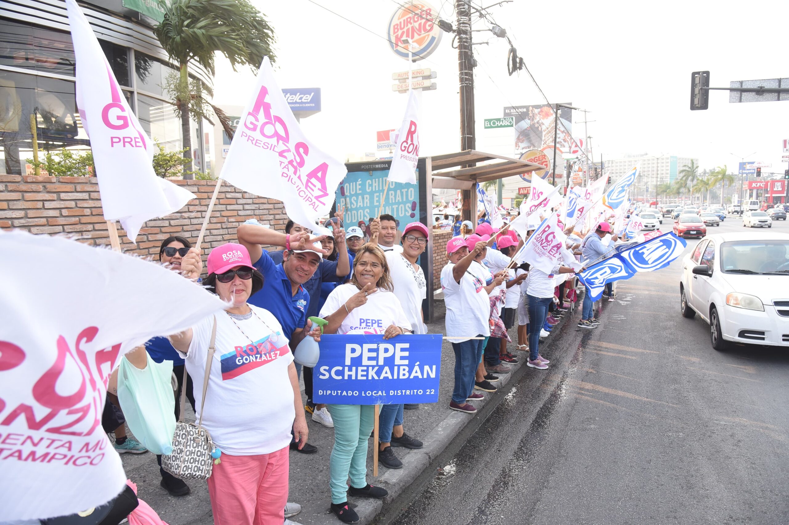 TAMPICO, TAMPS. Un gran ambiente se vivió este domingo en la prolongación de la avenida Hidalgo, con el espectacular bandereo a cargo de cientos de simpatizantes del Partido Acción Nacional y del Revolucionario Institucional que invitaron a la ciudadanía a seguir por el camino de la seguridad y el desarrollo con Rosa González Azcárraga en la Presidencia municipal de Tampico.