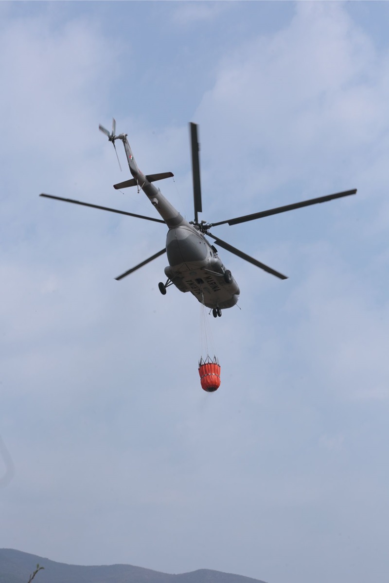 CIUDAD VICTORIA, TAMPS. El helicóptero MI-17, enviado por la Secretaría de Marina para combatir el incendio forestal en El Cañón del Novillo, comenzó su trabajo esta mañana y a lo largo del día se prevé realizará hasta 25 viajes, descargando en cada vuelo 2,500 litros de agua.