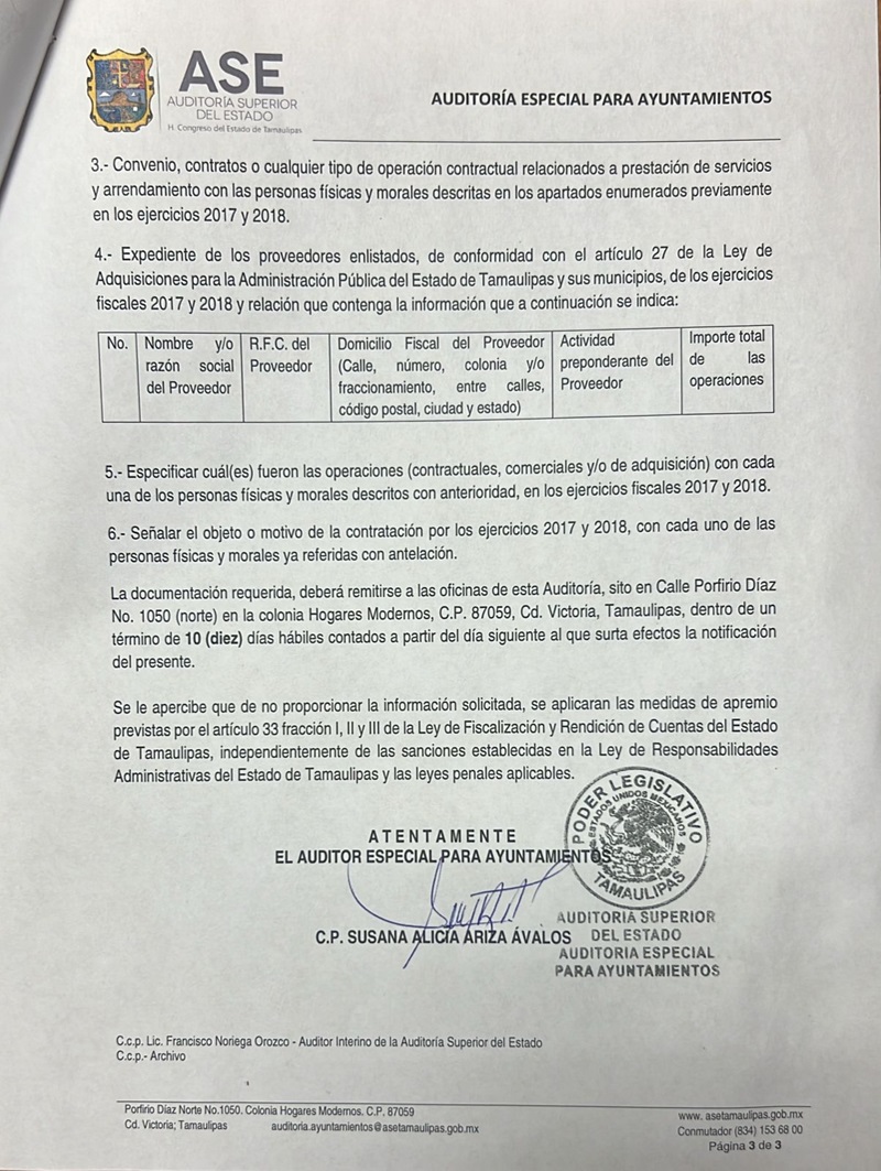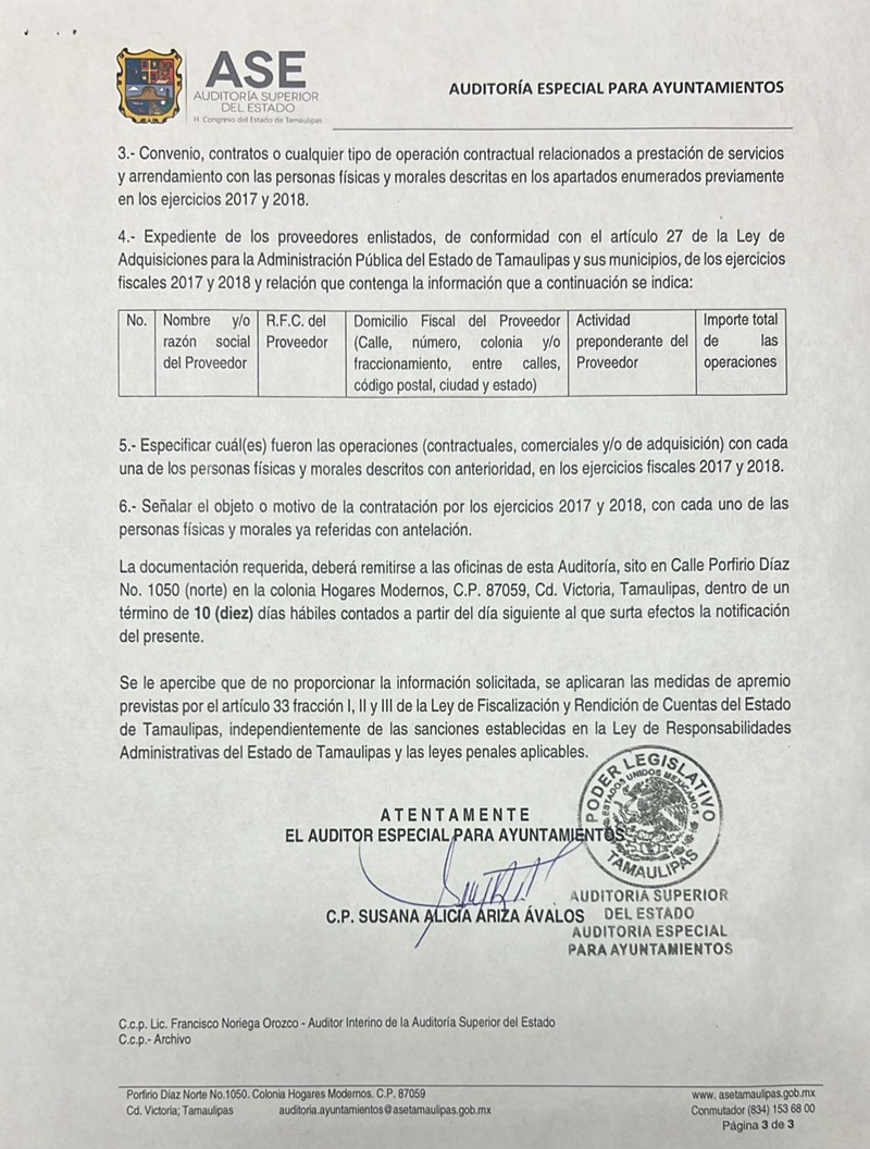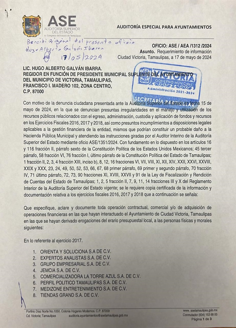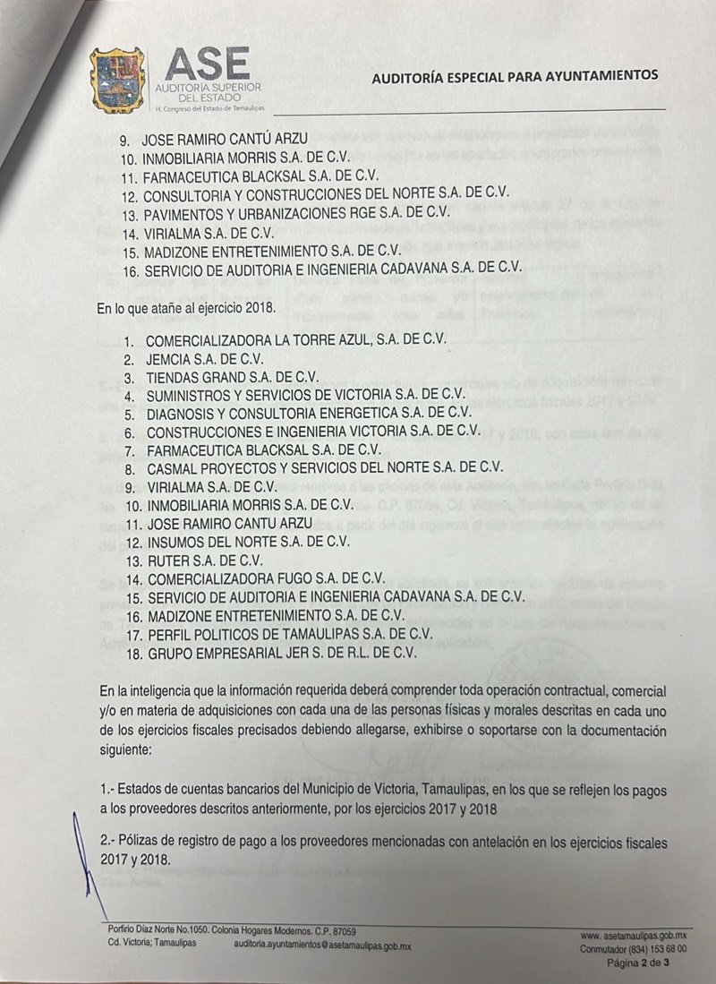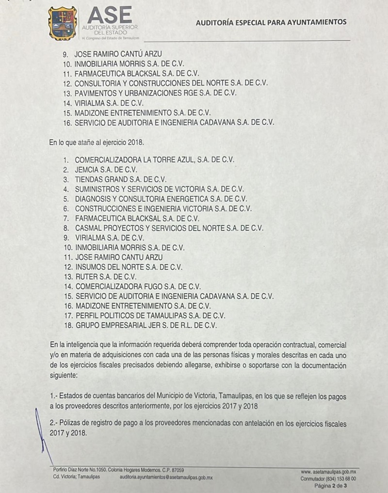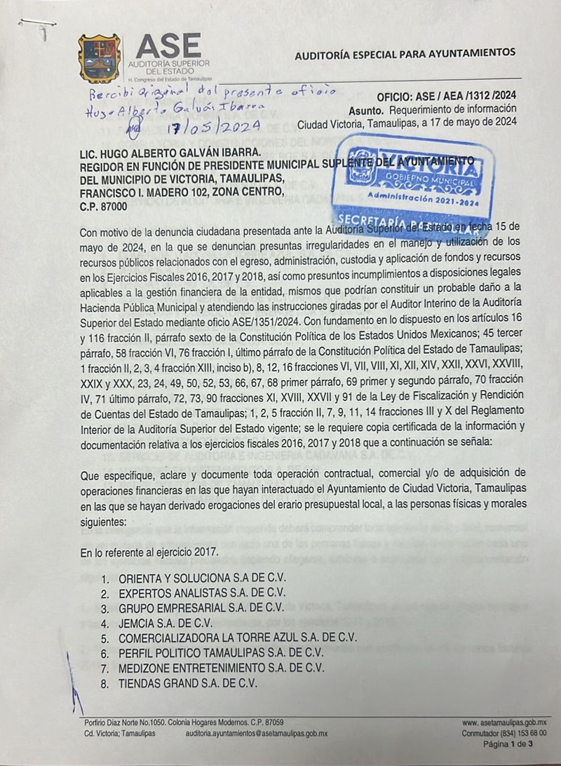 CIUDAD VICTORIA, TAMPS. La Auditoría Superior del Estado requirió al Ayuntamiento de Victoria toda la información de la administración municipal 2016-2018, que encabezó el panista Oscar Almaraz Smer, por considerar que existen 18 empresas a quienes se les hizo pagos millonarios con irregularidades que podrían constituir un probable daño a la hacienda pública municipal.