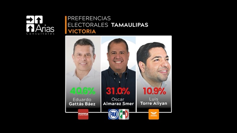 La encuesta realizada en aquella entidad, el candidato de Morena Eduardo Gattas ha obtenido 40.6%, seguido de la coalición PRI–PAN Almaraz Smer con el 31%, ministras que en tercer lugar se encuentra Torre Aliyan de Movimiento Ciudadano con 10.9%.