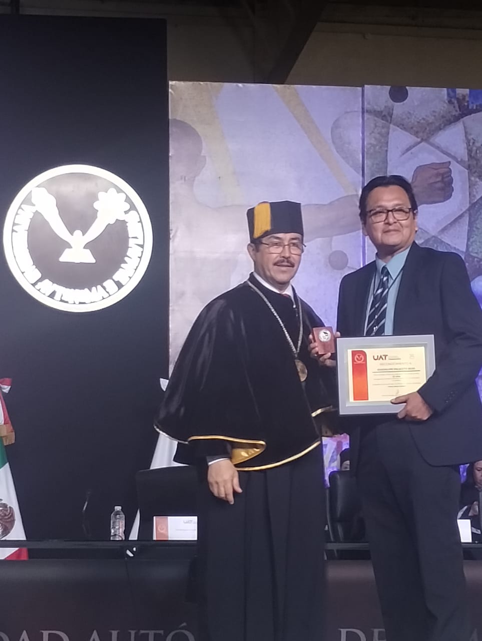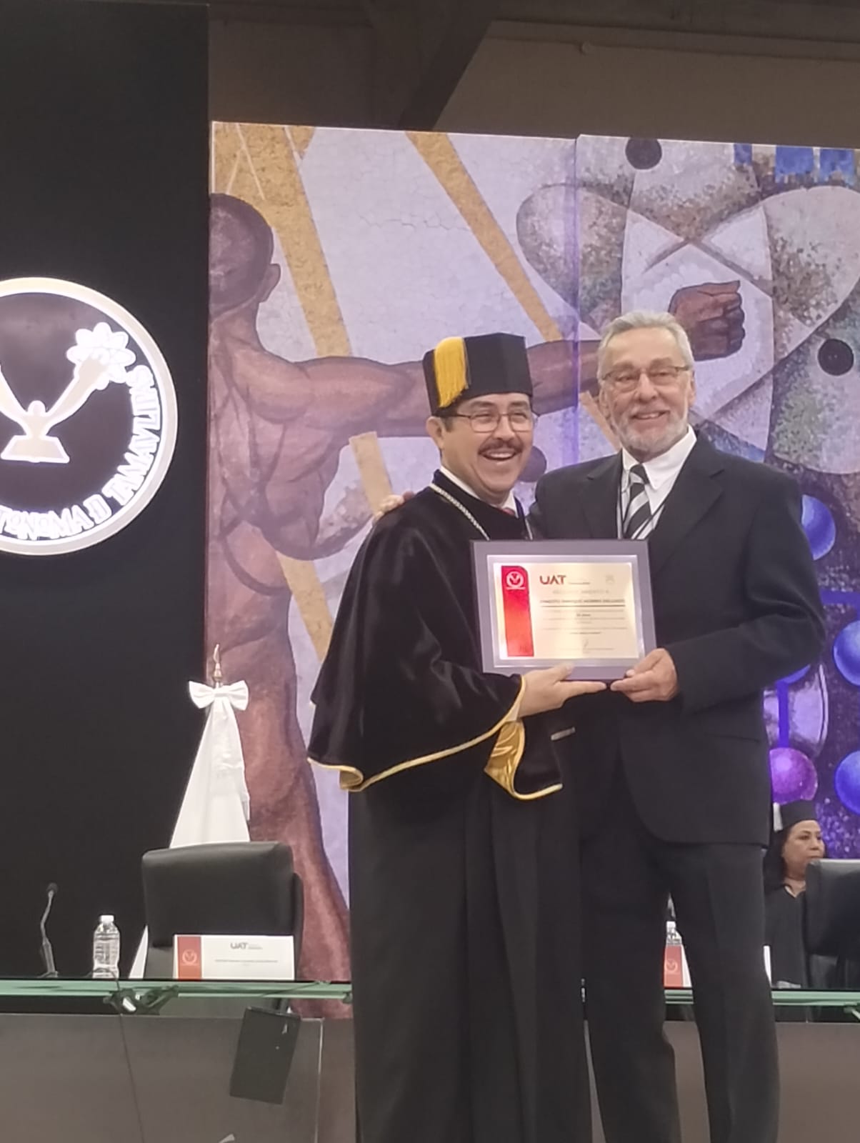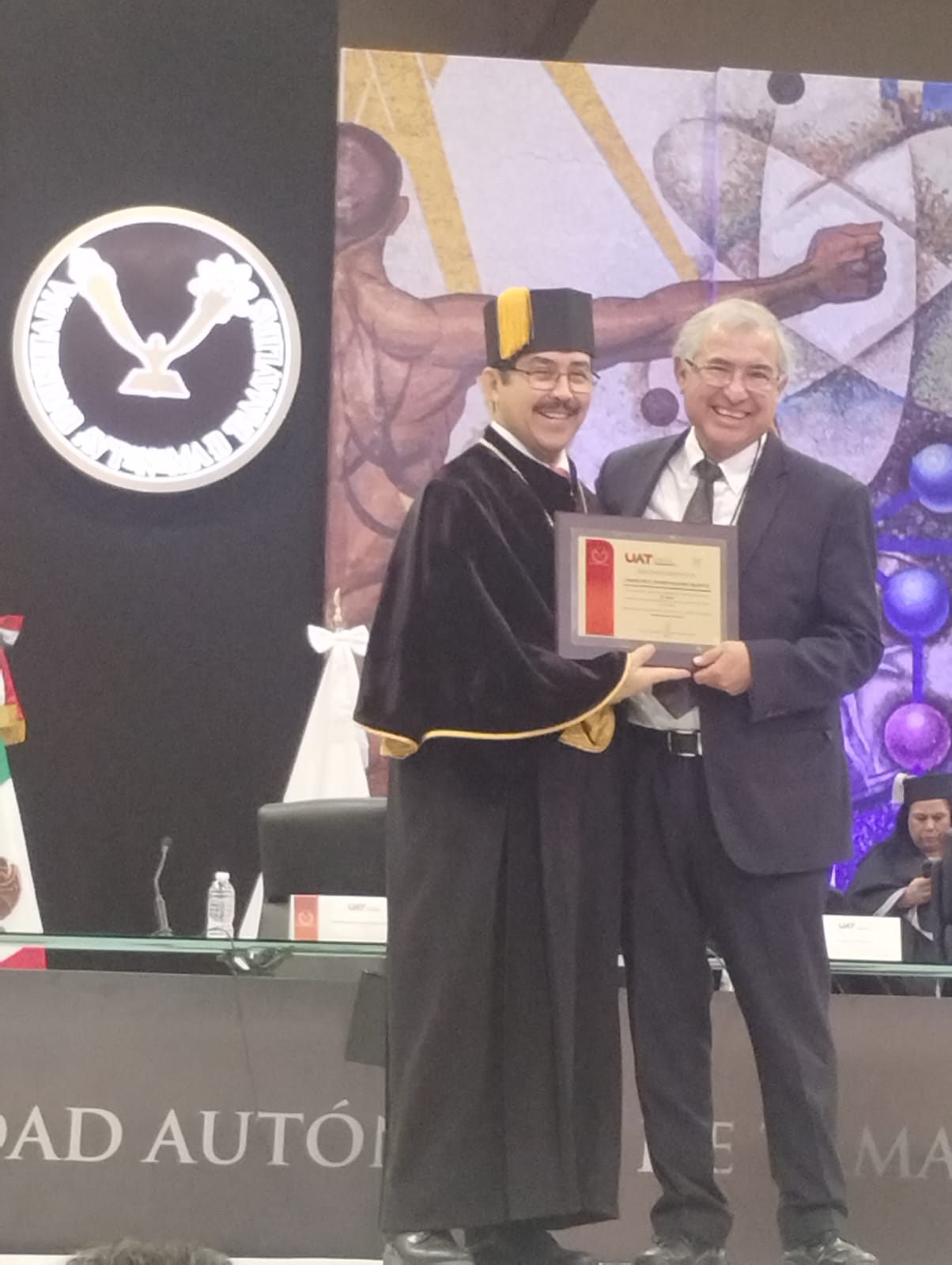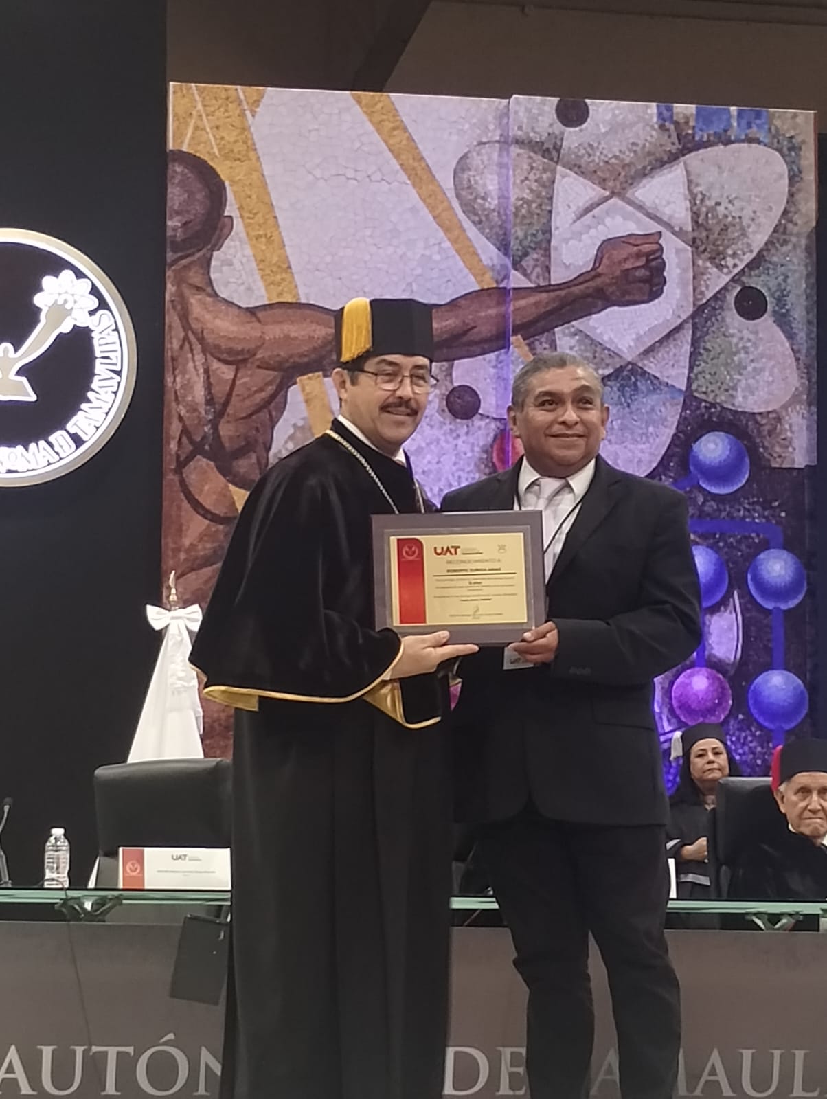 Los maestros fueron reconocidos por el Rector de la máxima casa de estudios de Tamaulipas, MVZ Dámaso Anaya Alvarado, en trascendente ceremonia llevada a cabo en el Gimnasio Multidisciplinario de la UAT en el Campus Victoria.