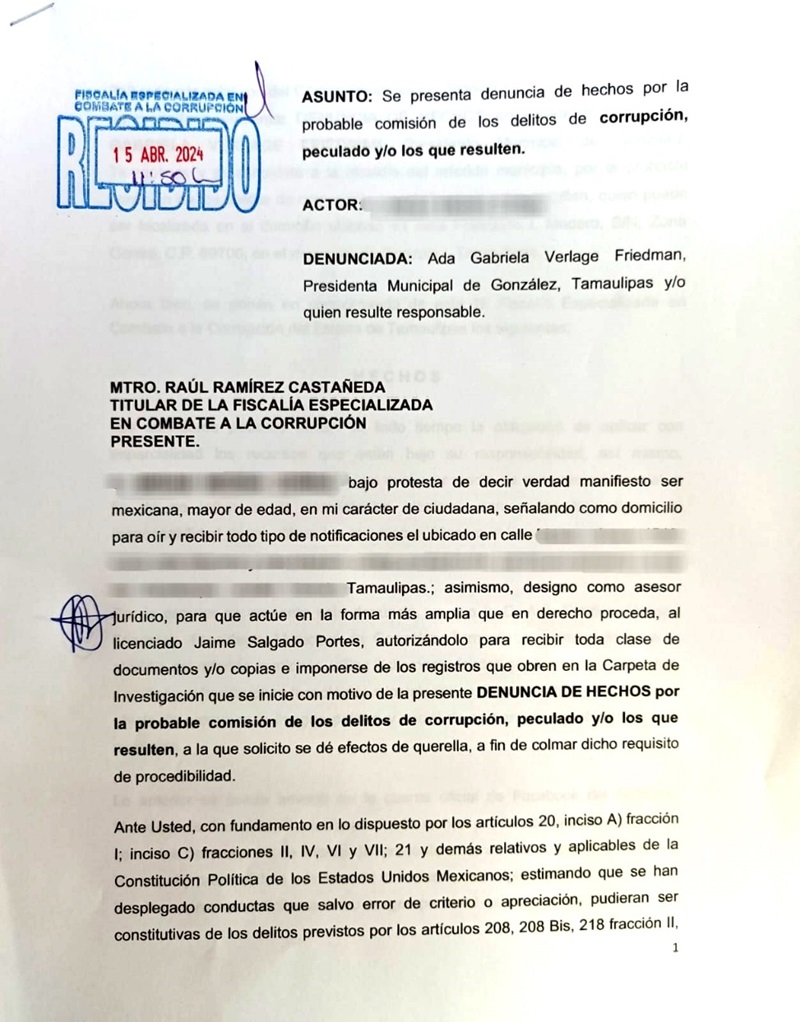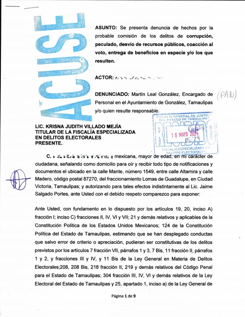 La denuncia, presentada el 16 de mayo ante la Fiscalía Especializada en Delitos Electorales en Tamaulipas, lo acusa de corrupción, peculado, desvío de recursos públicos, coacción del voto y entrega de beneficios en especie. Además, se le imputa la utilización ilegal de fondos para apoyar a la campaña de Verlage.