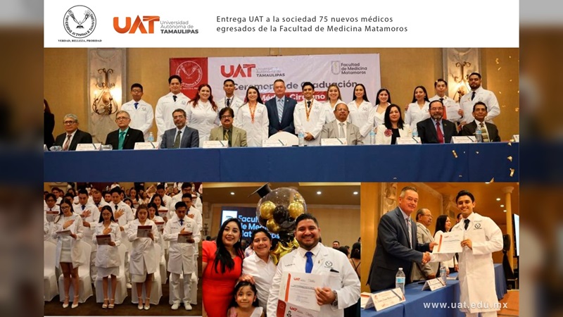 MATAMOROS, TAMPS. El pasado 24 de mayo, la Universidad Autónoma de Tamaulipas celebró la ceremonia de graduación de 75 estudiantes de la Facultad de Medicina Matamoros, quienes concluyeron satisfactoriamente sus estudios del programa educativo de Médico Cirujano en la generación 2019-2024.