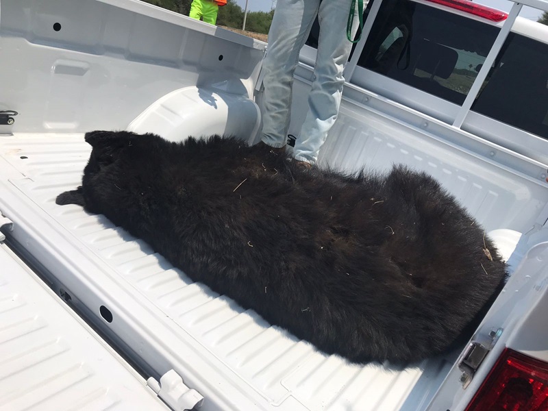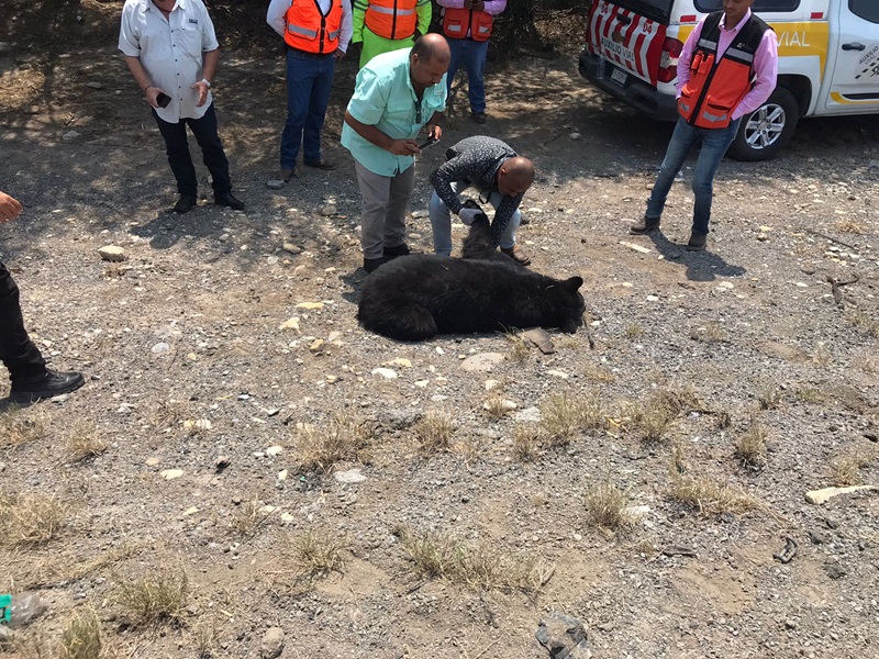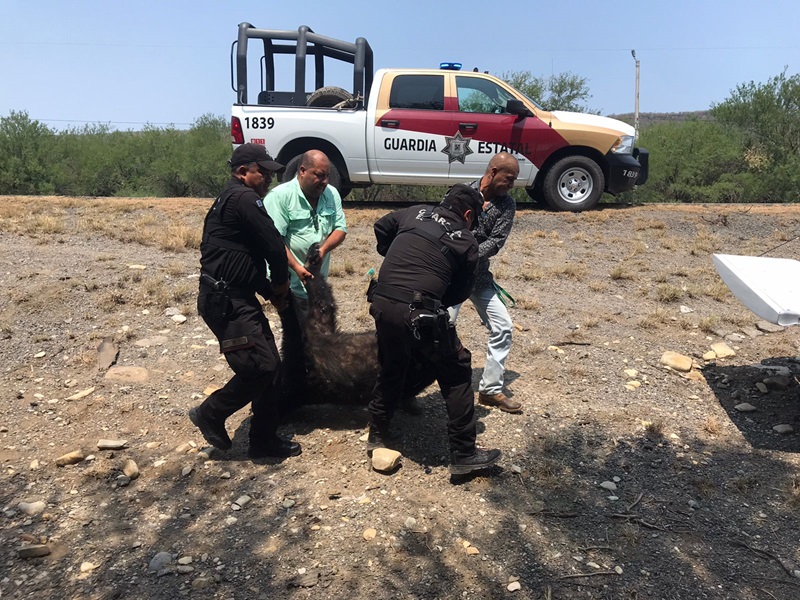 LLERA, TAMPS. Personal de la Guardia Estatal acudió al kilómetro 25 de la Carretera Federal 83 para colaborar con elementos de la Procuraduría Federal de Protección al Ambiente (PROFEPA) en el retiro de un oso muerto que se encontraba sobre el tramo carretero Hidalgo-González.