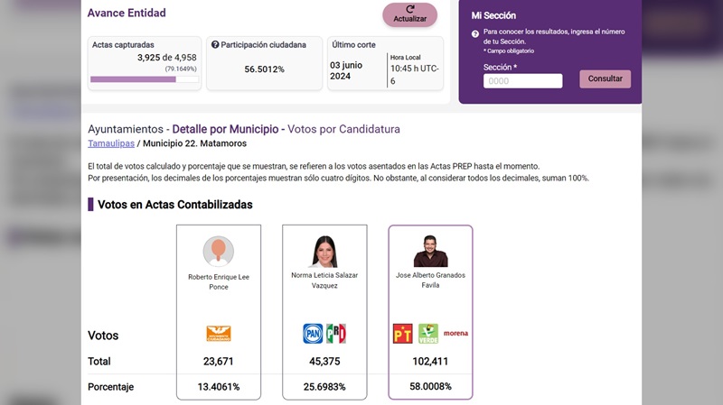 MATAMOROS, TAMPS. De acuerdo con el Programa de Resultados Electorales Preliminares (PREP) hasta el momento, el candidato de la coalición «Sigamos Haciendo Historia» a la alcaldía de Matamoros, José Alberto «Beto» Granados Favila, suma 96 mil 976 votos con el 75.05% por ciento de las actas capturadas.