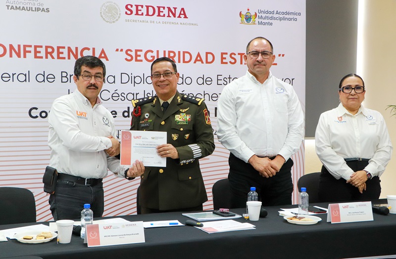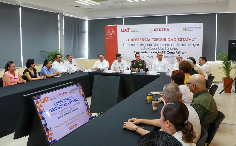 EL MANTE, TAMPS. La Universidad Autónoma de Tamaulipas (UAT) organizó una conferencia sobre las funciones y el desempeño de la Secretaría de la Defensa Nacional (SEDENA), en el marco de la Reunión de Seguridad que se realizó en la Unidad Académica Multidisciplinaria Mante.