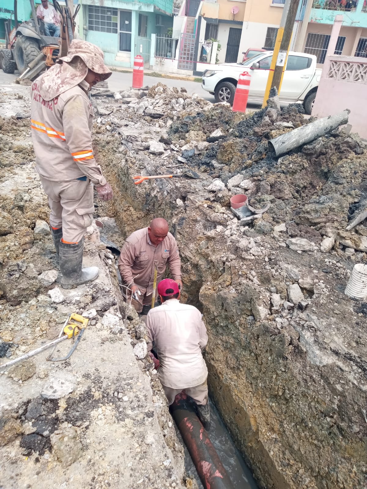 ALTAMIRA, TAMPS. La Comisión Municipal de Agua Potable y Alcantarillado de Altamira, que dirige el Ing. Omar Hernández Leines, llevó a cabo en tiempo y forma la reposición de una línea general de drenaje en el Fraccionamiento Villas de Champayán, así como trabajos de mantenimiento a tuberías hidrosanitarias en las colonias Primavera y Adolfo López Mateos.