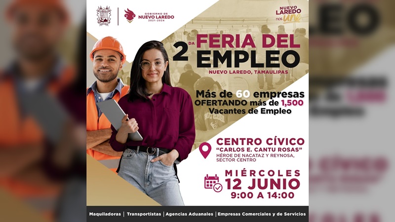 El evento tendrá lugar en el Centro Cívico “Carlos Cantú Rosas”, será de 9:00 AM a 2:00 PM y en el lugar se encontrarán 65 empresas que ofertarán más de mil 500 vacantes.