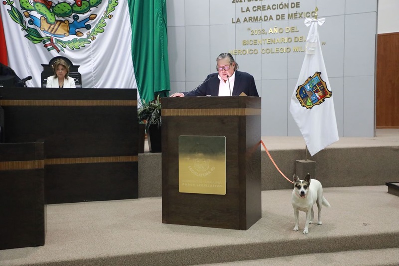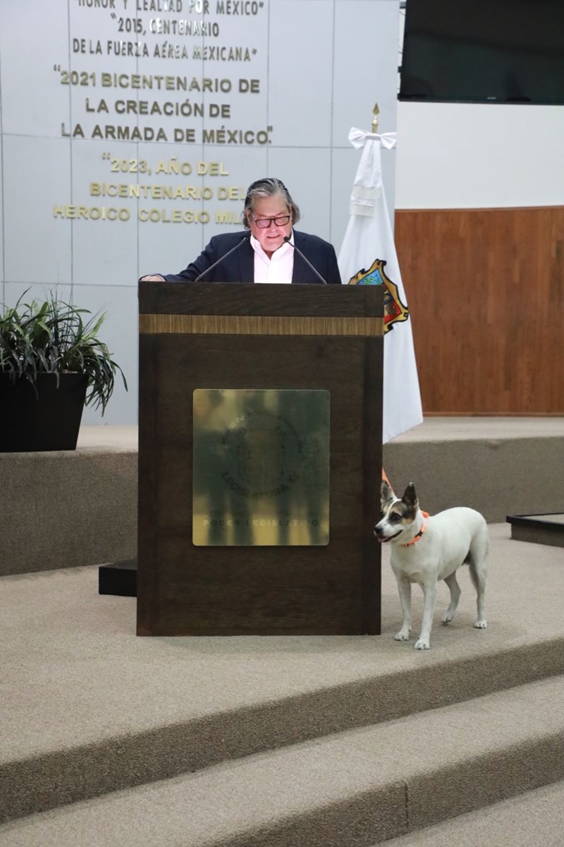 Es importante destacar que Cárdenas Gutiérrez, representante del partido Movimiento Ciudadano, llegó a presentar su iniciativa acompañada de Perrucha, quien arribó al pleno legislativo, ataviada en color naranja, además de permanecer con el diputado en la tribuna.