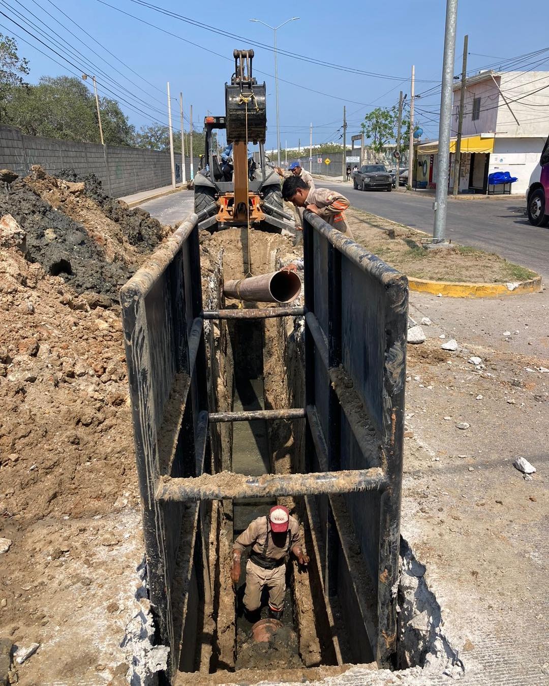 En el primer sector, se llevan cabo en tiempo y forma trabajos de reposición de tubería de 14 pulgadas, de pvc, en la calle Revolución Humanista, mientras que en la colonia Loma Alta se realiza la reparación de línea general drenaje con tubería de pvc alcantarillado, de 8 pulgadas, en calle Océano Atlántico esquina con Cuauhtémoc.