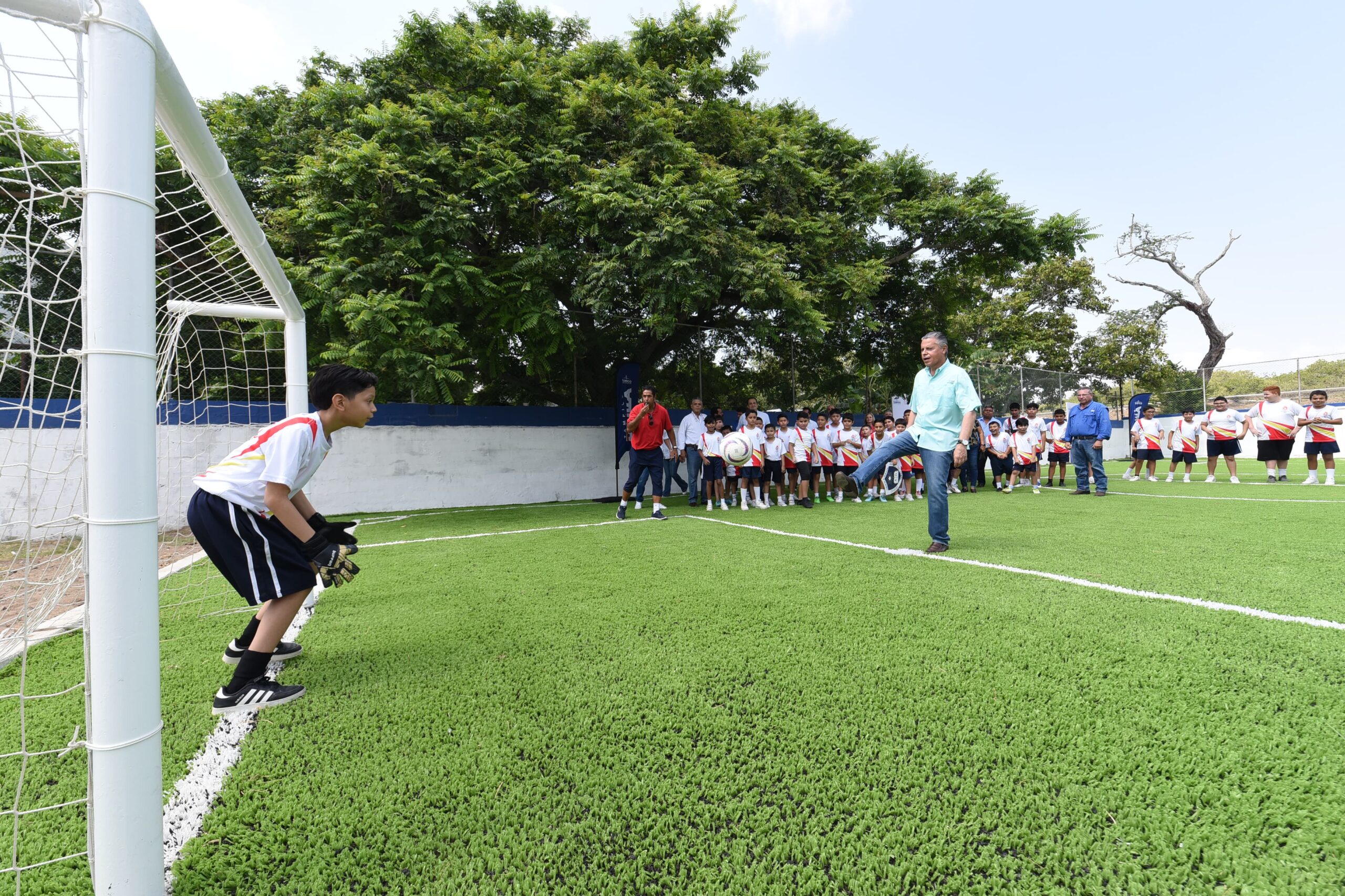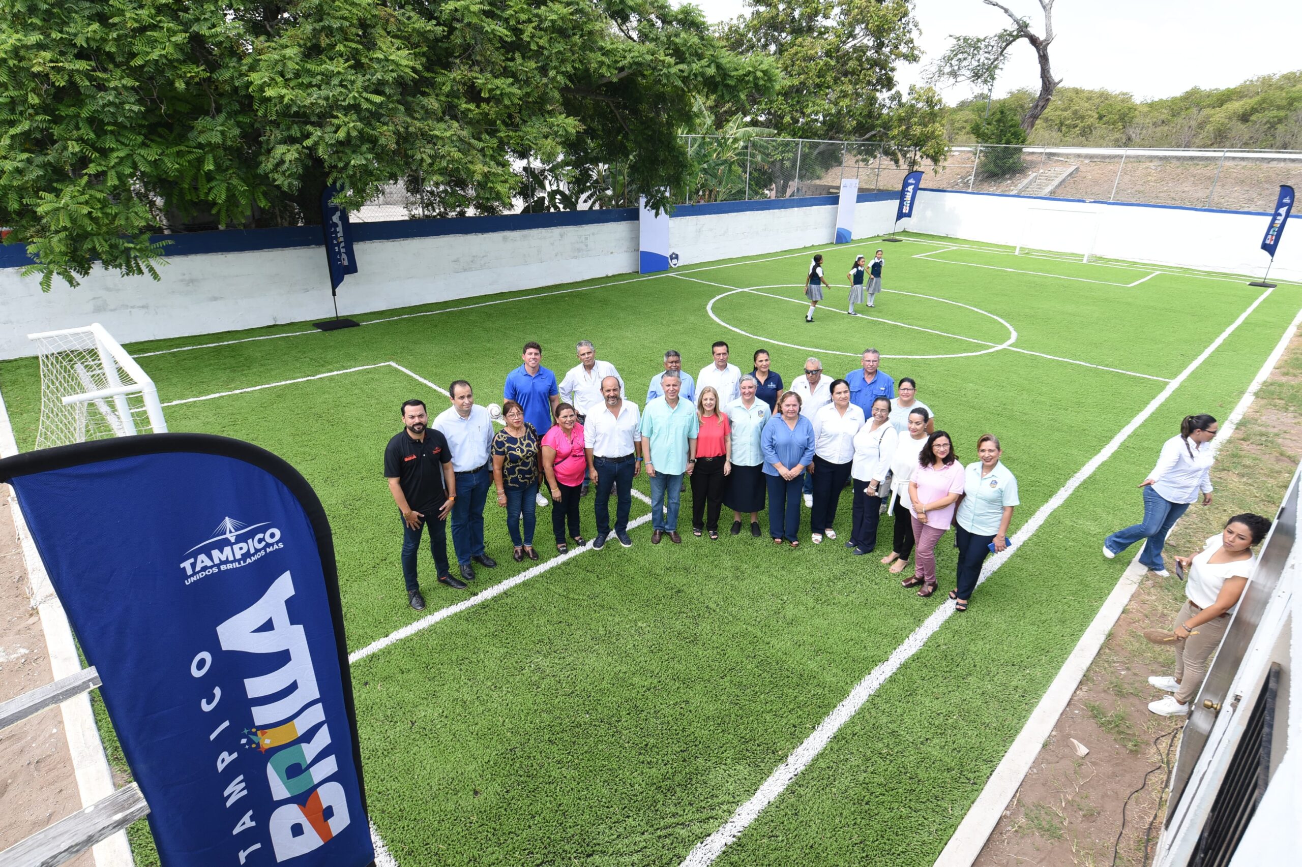 TAMPICO, TAMPS. Con la finalidad de seguir ampliando y mejorando la infraestructura deportiva en el entorno escolar, el Presidente municipal Chucho Nader entregó este día la construcción de una moderna cancha de futbol con pasto sintético en la escuela primaria «Pablo María Guzmán» de la colonia Nacional.