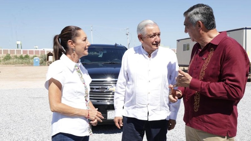 López Obrador y Sheinbaum llegaron la noche del pasado 14 de junio a Nuevo Laredo y el 15 de junio recibieron información sobre el avance de esta magna obra de parte del secretario de la Defensa Nacional, Luis Cresencio Sandoval y el director general de Aduanas, André Georges Foullon Van Lissum.