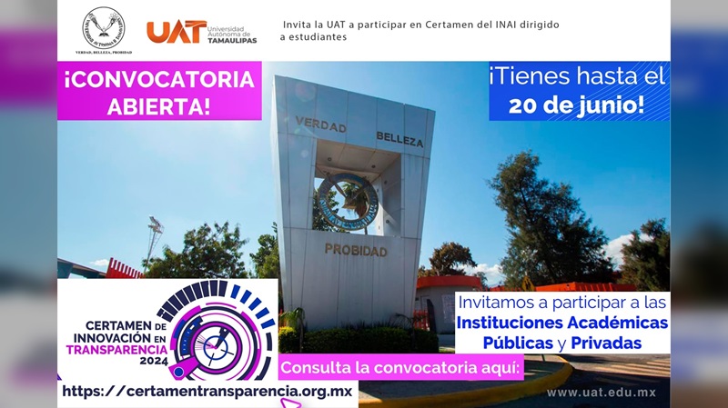 CIUDAD VICTORIA, TAMPS. La Universidad Autónoma de Tamaulipas (UAT) hace extensiva a su comunidad la convocatoria del Certamen de Innovación en Transparencia 2024, organizado por el Instituto Nacional de Transparencia, Acceso a la Información y Protección de Datos Personales (INAI).