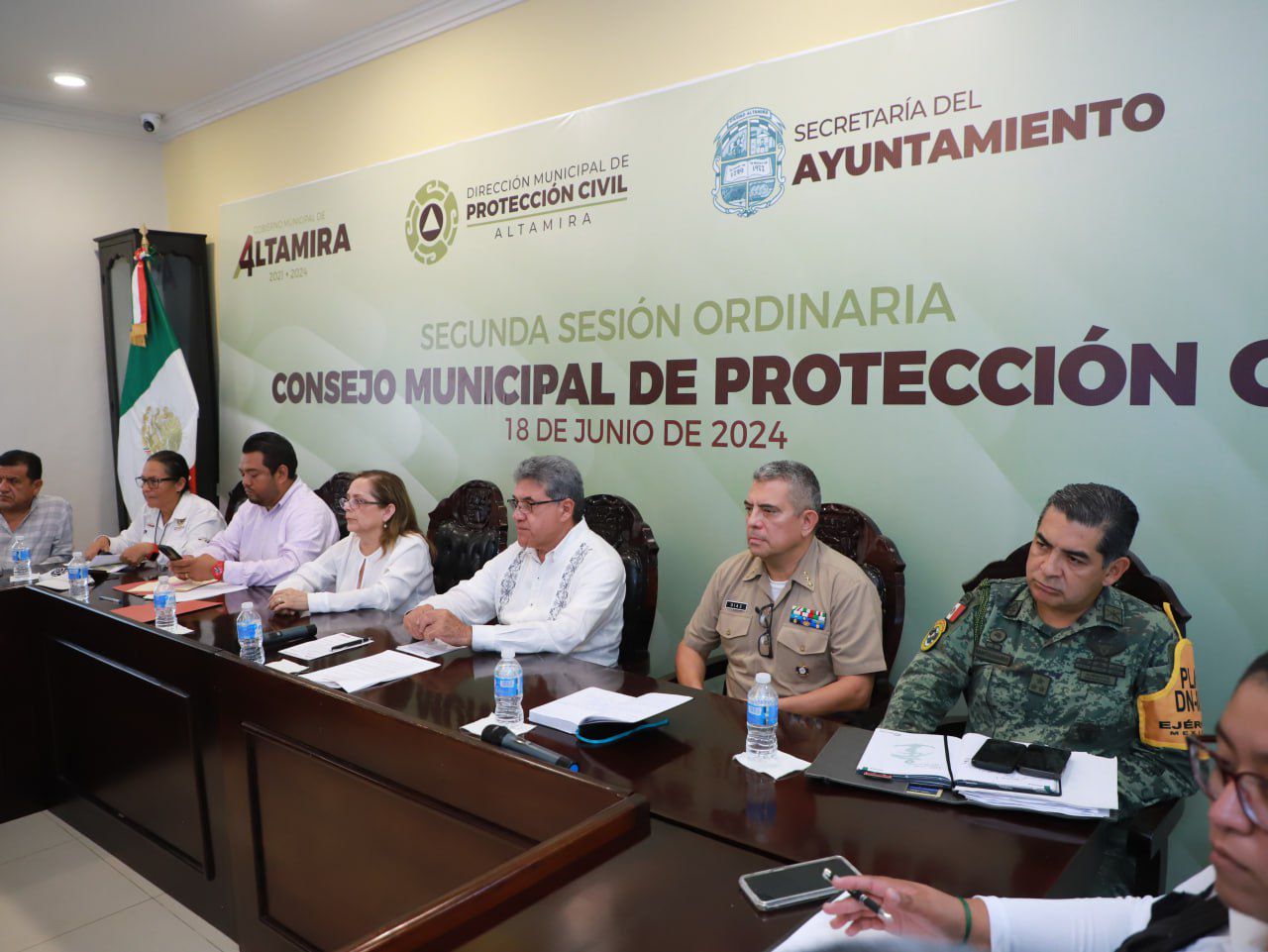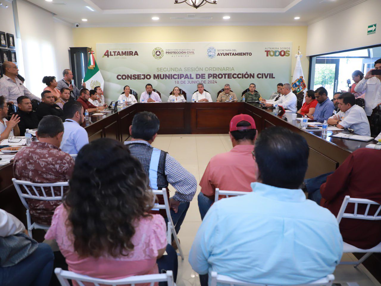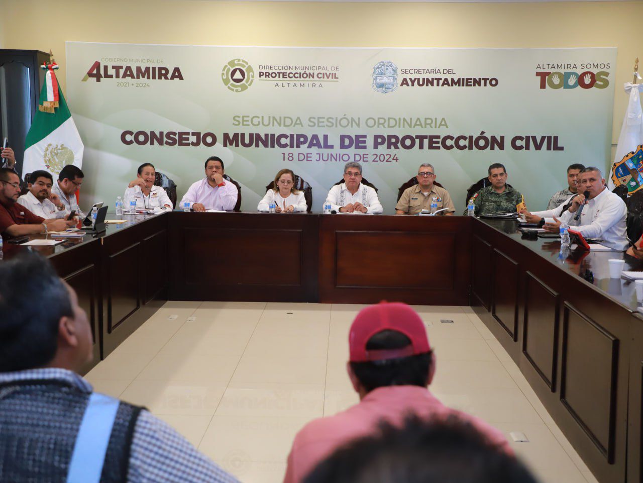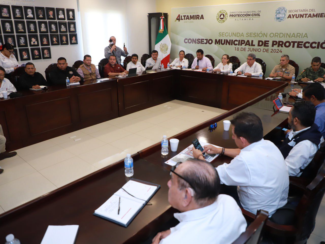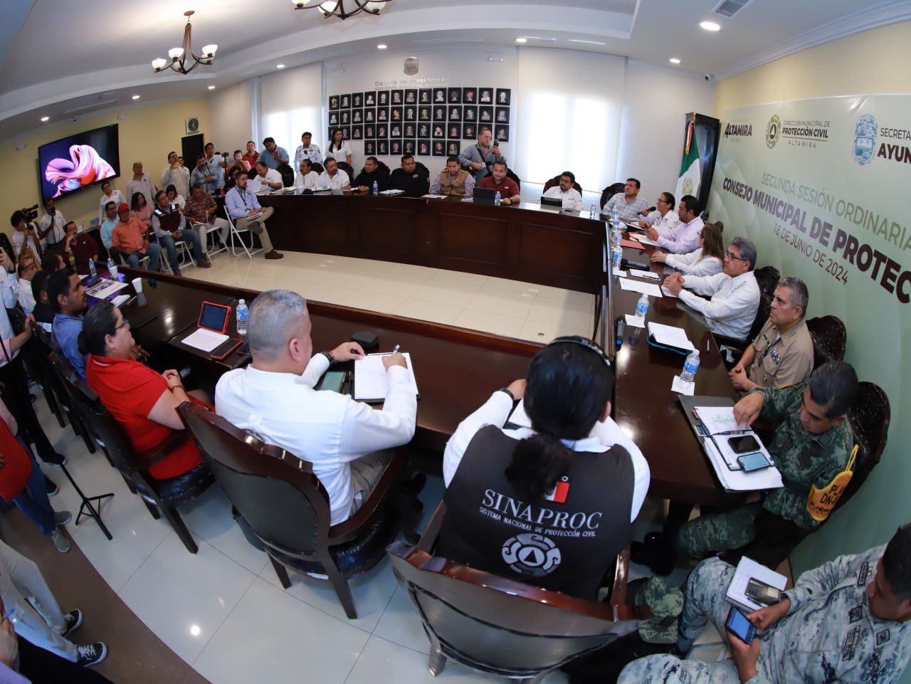 ALTAMIRA, TAMPS. En la Sala de Cabildo de la presidencia municipal de Altamira, se llevó a cabo la segunda sesión extraordinaria del Consejo Municipal de Protección Civil, presidida por el alcalde, Dr. Armando Martínez Manríquez. En esta importante reunión, se contó con la participación de diversas dependencias estatales, municipales y cuerpos del orden, quienes compartieron un informe detallado de los recursos disponibles para afrontar la temporada de ciclones y prevenir accidentes como inundaciones.