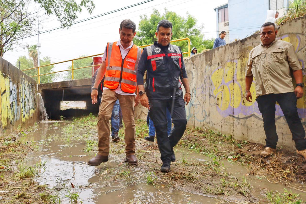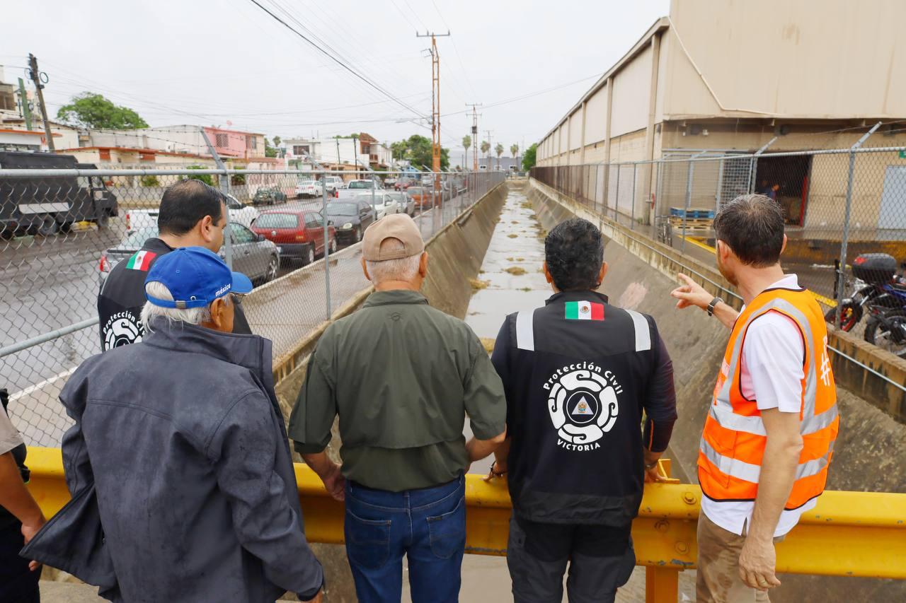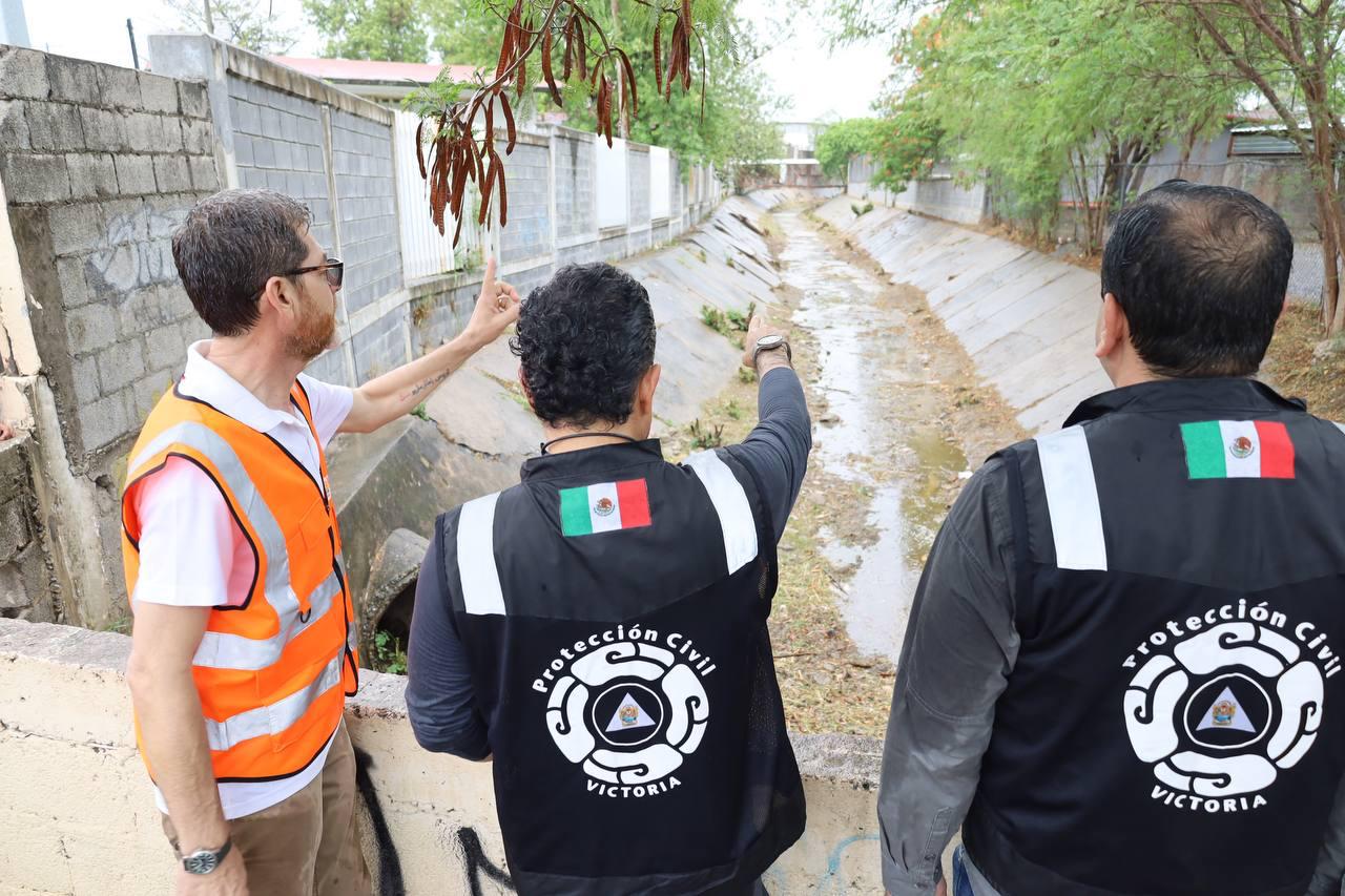 Bajo una pertinaz llovizna, el alcalde victorense recorrió, con personal operativo de Protección Civil y brigadas de Servicios Públicos, tramos de la red de desague Adelitas, Boulevard López Mateos y Fovissste de dónde se retiró basura y maleza para el rápido desahogo del agua pluvial.