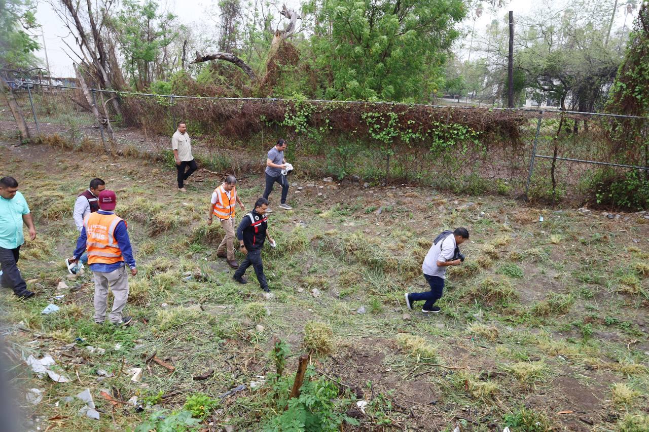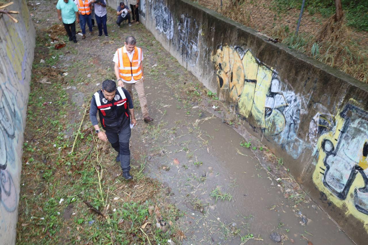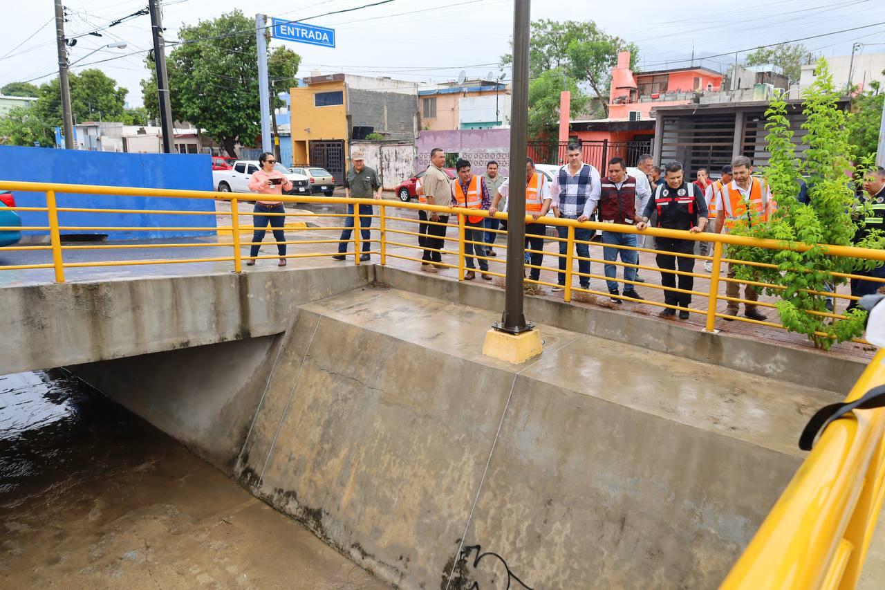 Bajo una pertinaz llovizna, el alcalde victorense recorrió, con personal operativo de Protección Civil y brigadas de Servicios Públicos, tramos de la red de desague Adelitas, Boulevard López Mateos y Fovissste de dónde se retiró basura y maleza para el rápido desahogo del agua pluvial.