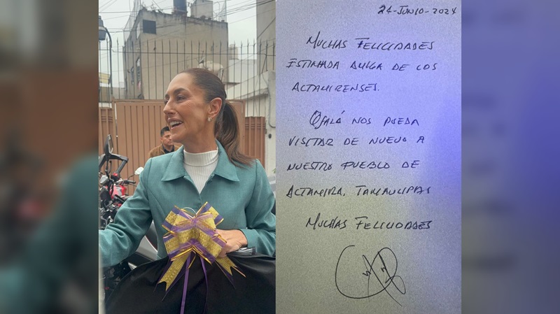 «Muchas felicidades, estimada amiga de los altamirenses. Ojalá nos pueda visitar de nuevo en nuestro pueblo de Altamira, Tamaulipas. Muchas felicidades», fue la dedicatoria escrita de puño y letra por el alcalde Martínez Manríquez, acompañando al regalo.