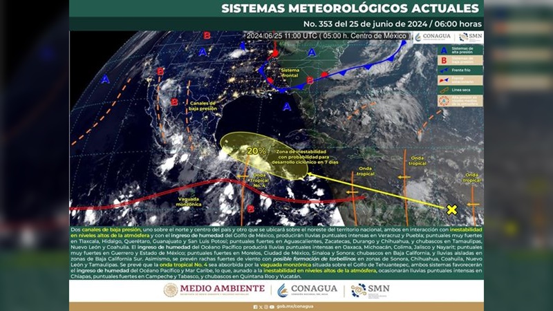 Por otra parte, se prevé que la onda tropical No. 4 sea absorbida por la vaguada monzónica situada sobre el Golfo de Tehuantepec, ambos sistemas favorecerán el ingreso de humedad del Océano Pacífico y Mar Caribe.