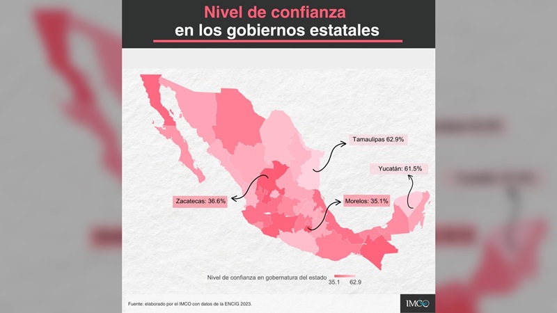 Tamaulipas se ubica por encima del gobierno de Yucatán, que suma un 61.5% por ciento de nivel de confianza, seguido por Coahuila con 58.5% por ciento, Guerrero con 58.3% por ciento y Aguascalientes con 57.6% por ciento.