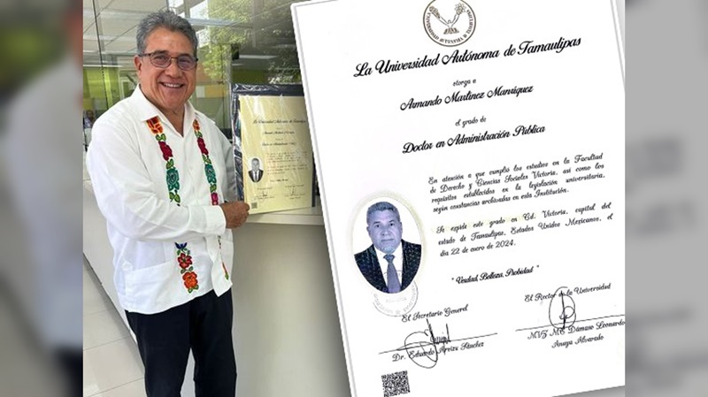 ALTAMIRA, TAMPS. Armando Martínez Manríquez, alcalde de Altamira ha sido distinguido por la Universidad Autónoma de Tamaulipas (UAT) con el grado de Doctor en Administración Pública, junto con una mención honorífica que reconoce su esfuerzo y brillante trayectoria académica.