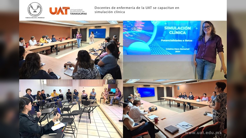 CIUDAD VICTORIA, TAMPS. Docentes de la Facultad de Enfermería Tampico de la Universidad Autónoma de Tamaulipas (UAT) se capacitan a través de un curso titulado «Simulación clínica, potencialidades y retos», que se lleva a cabo en ese plantel universitario del Campus Sur.