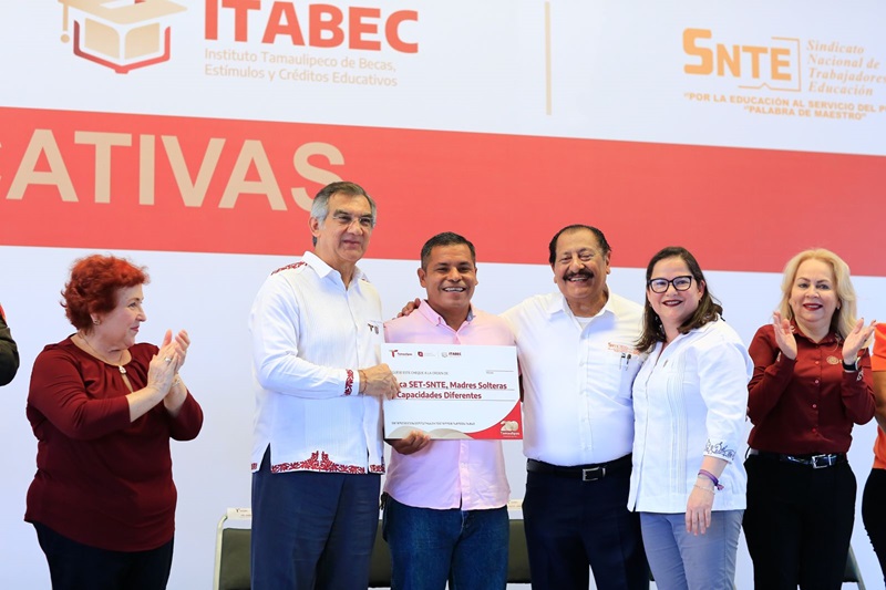 El secretario general de la Sección 30 del SNTE, Arnulfo Rodríguez Treviño, agradeció al gobernador Américo Villarreal la entrega de estas becas educativas.