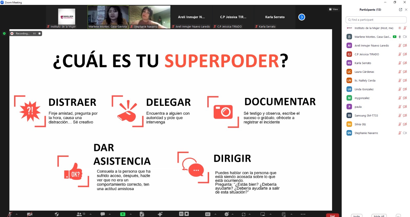 Otro de los consejos que se brindaron fue cortar con efecto transeúnte: el cual consiste en 3 pasos, evaluar la situación y priorizar nuestra seguridad, ser consciente de qué es lo que hace que no podamos actuar y decidir cuál de las 5D funciona mejor en ese momento.